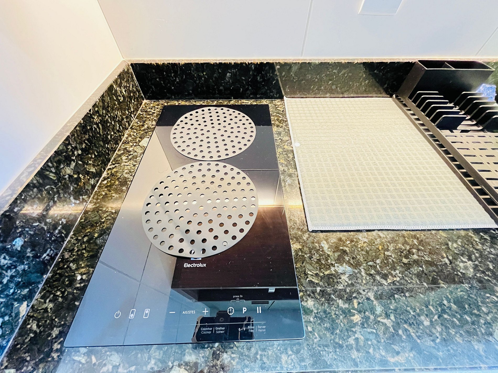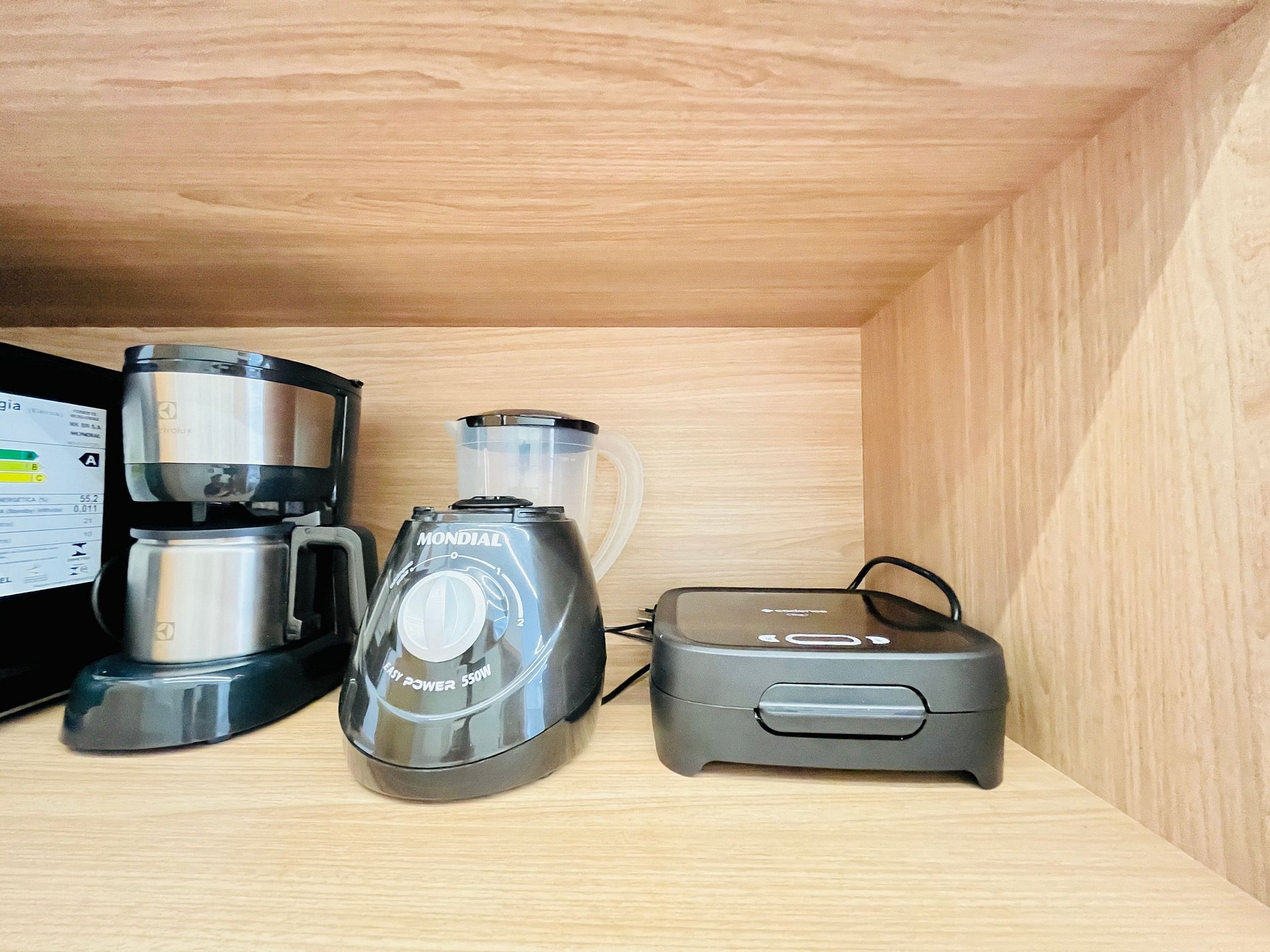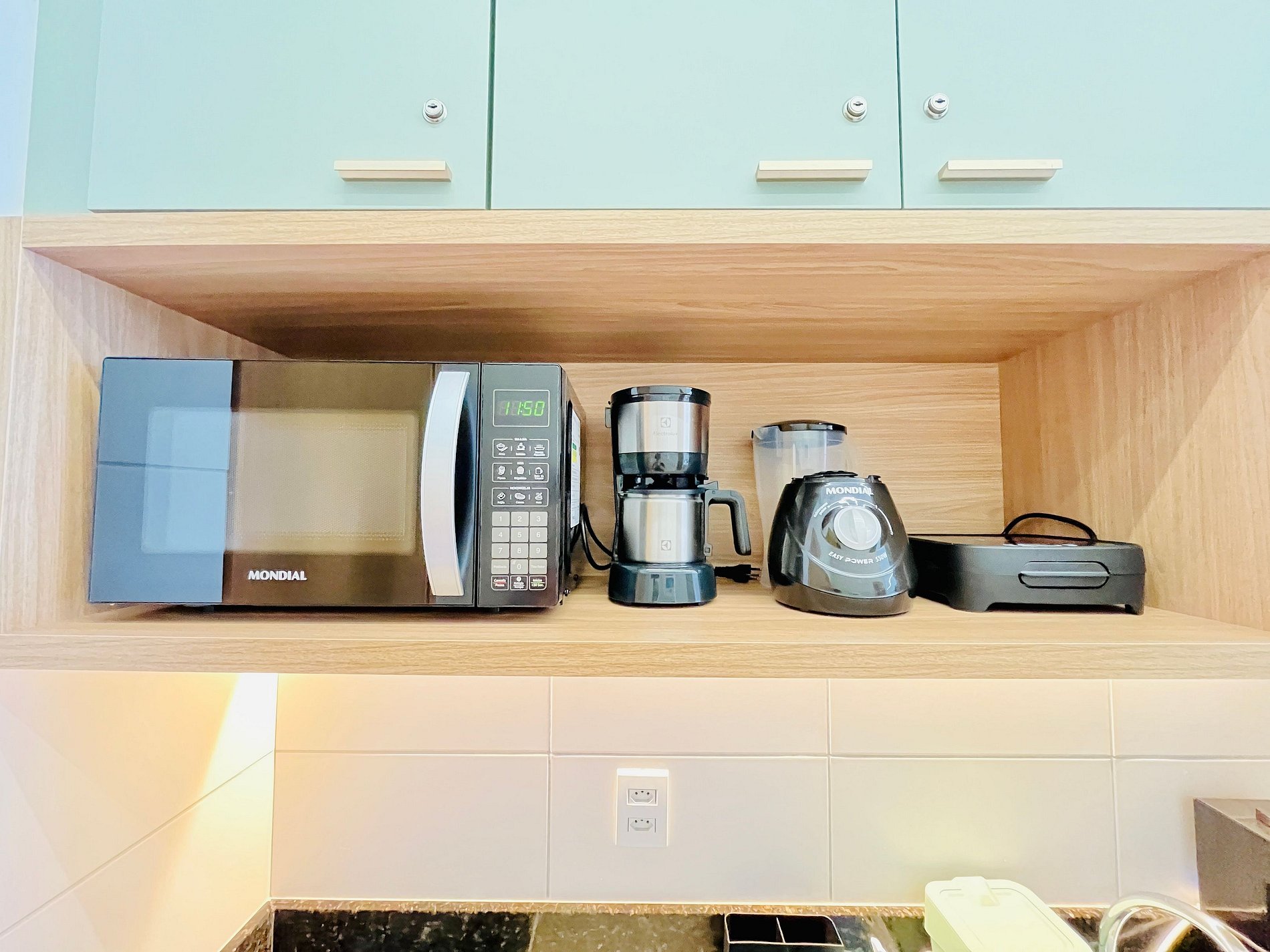 - Cozinha equipada com geladeira, micro-ondas, cooktop elétrico, cafeteira, sanduicheira, liquidificador e utensílios diversos