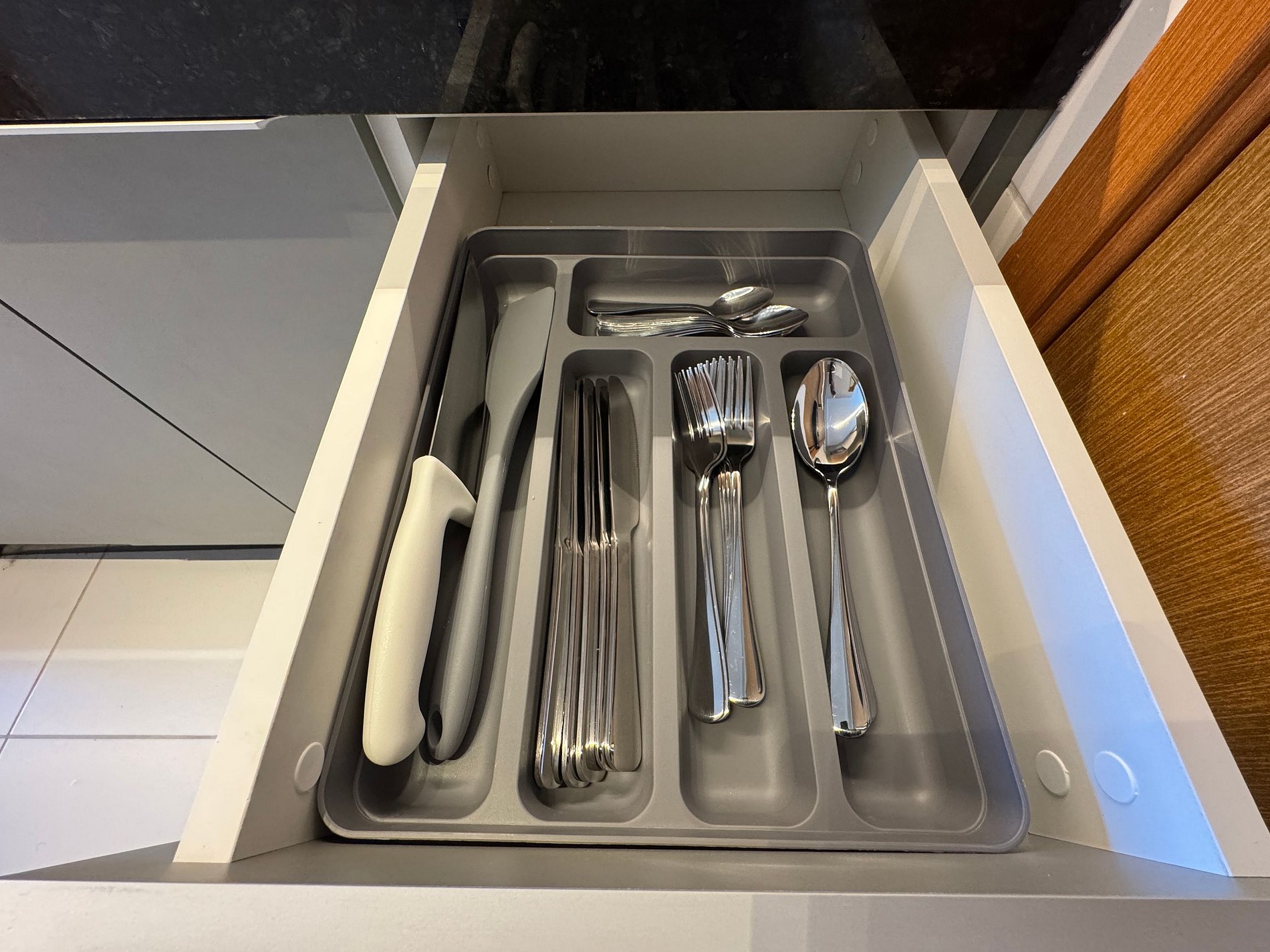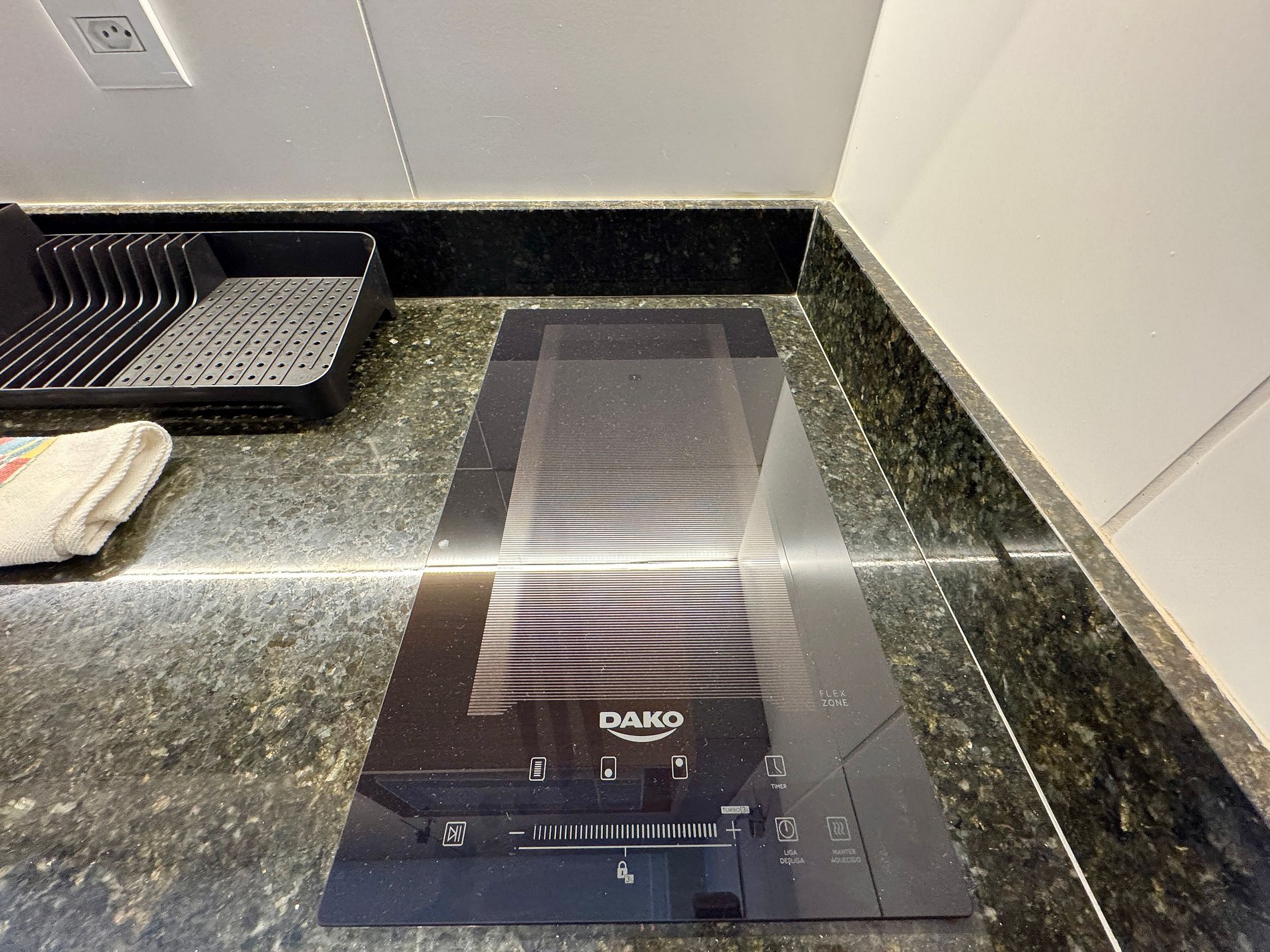 - Cozinha equipada com geladeira, micro-ondas, cooktop elétrico, airfryer, cafeteiram liquidificador, sanduicheira e utensílios diversos