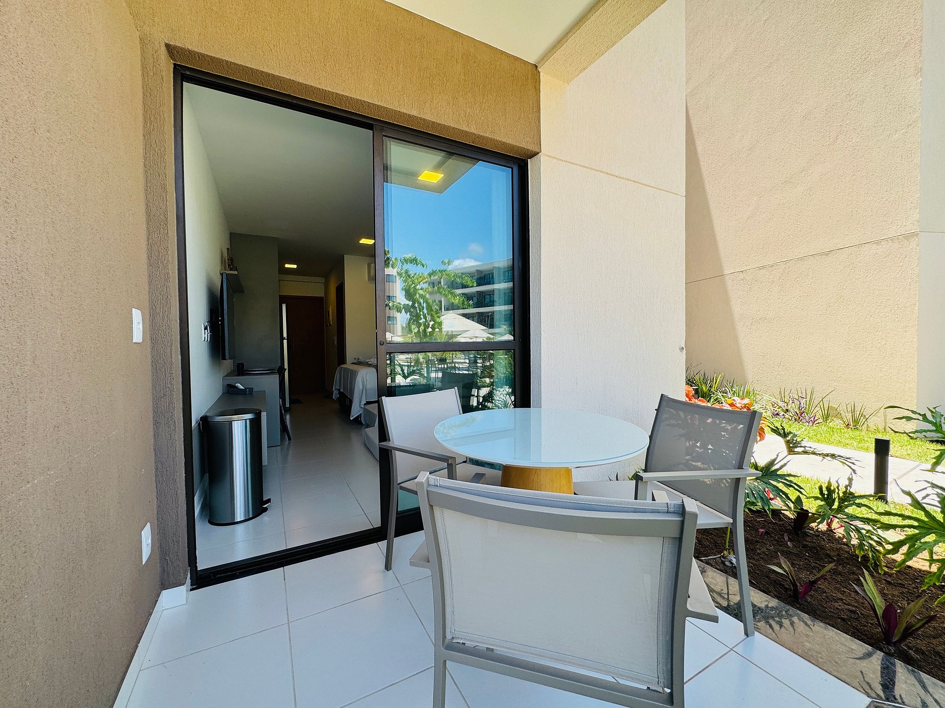 O apartamento é terréo com vista para piscina e totalmente mobiliado, proporcionando um ambiente confortável e funcional, equipado com todas as comodidades essenciais para sua estadia.