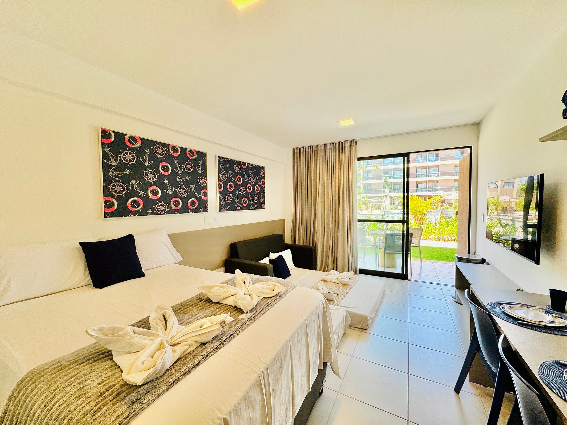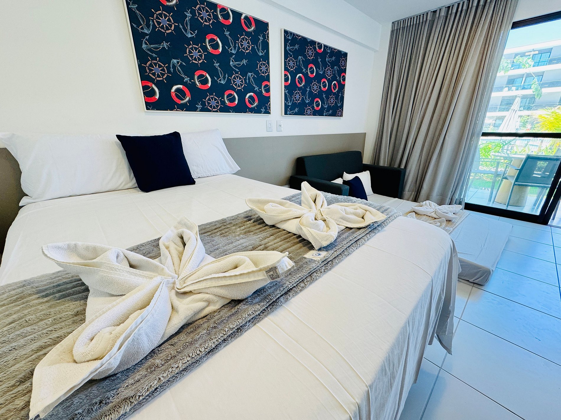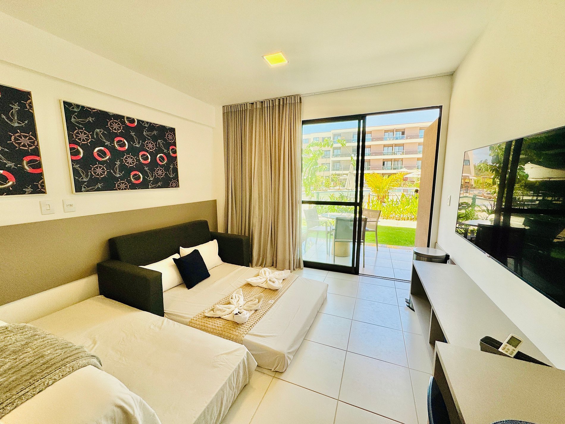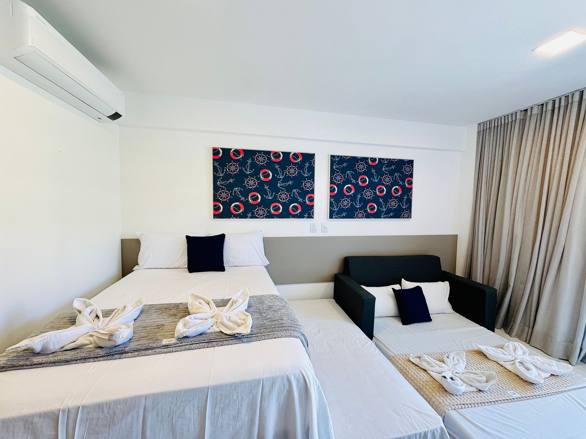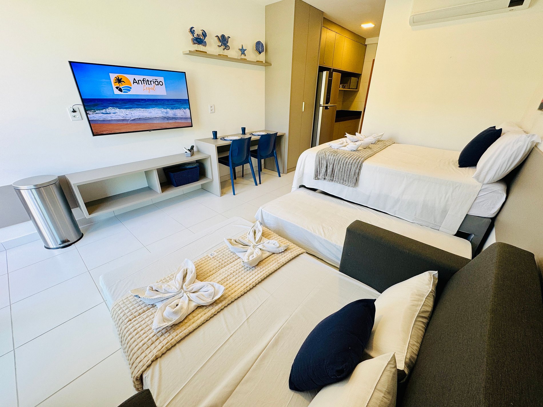 Flat moderno a 300m da praia e perto das piscinas naturais. Acomoda até 5 pessoas, com cama de casal com bicama e sofá-cama de casal. Equipado com Wi-Fi, Smart TV, ar-condicionado e cozinha completa. O condomínio estilo resort oferece piscinas, restaurante, rooftop, academia, brinquedoteca, coworking, churrasqueira e estacionamento gratuito. Conforto e lazer garantidos para sua estadia!