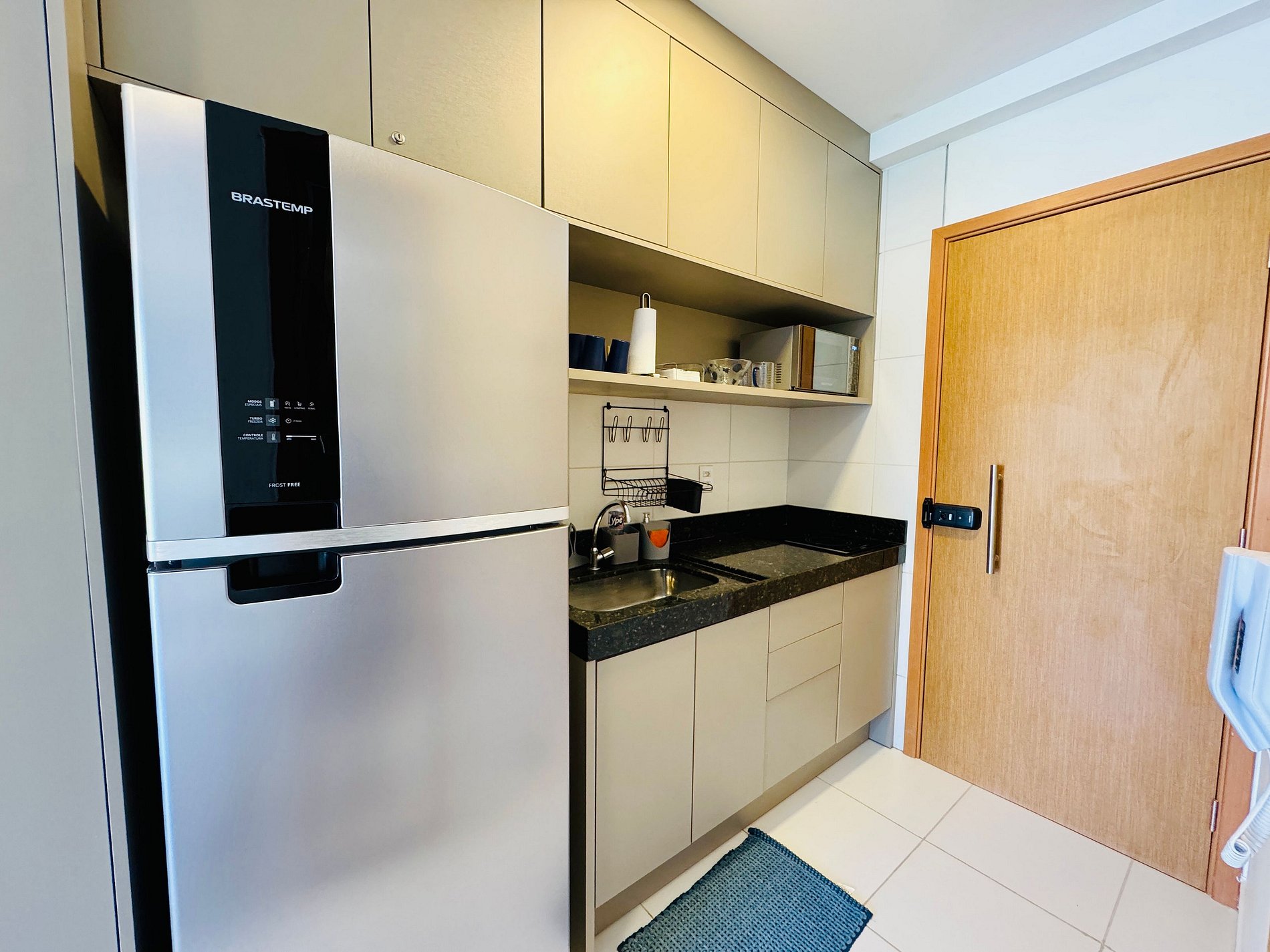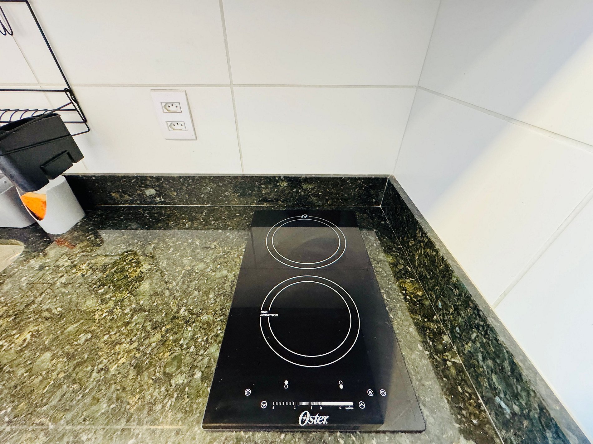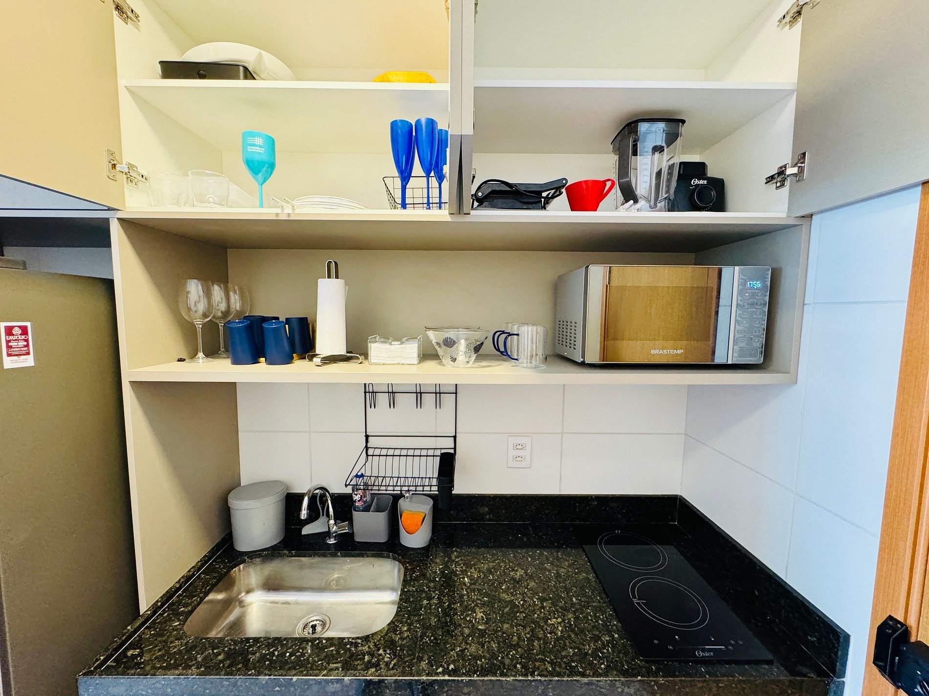 - Cozinha equipada com geladeira, micro-ondas, cooktop elétrico, cafeteira, airfryer, sanduicheira, liquidificador e utensílios diversos