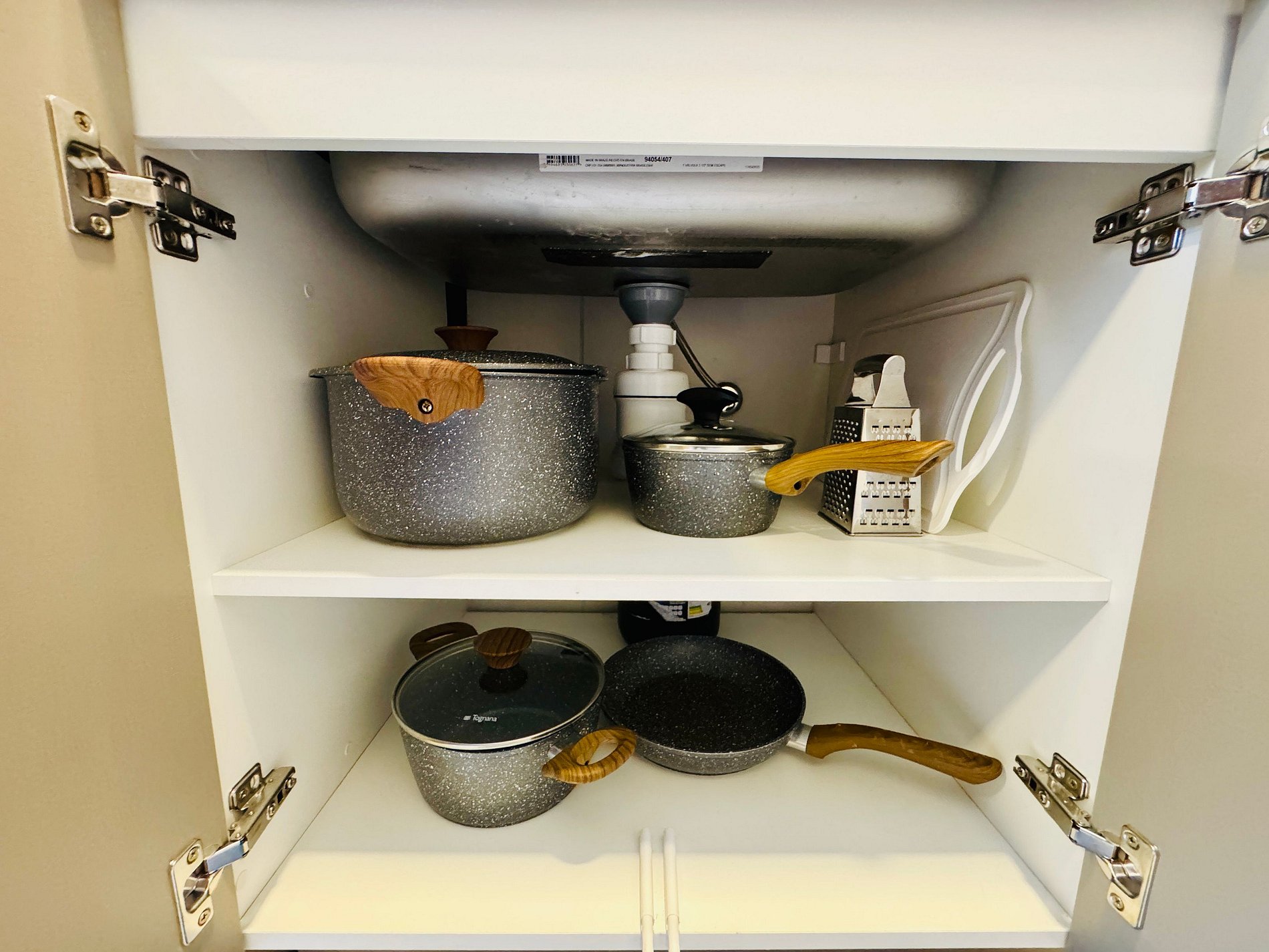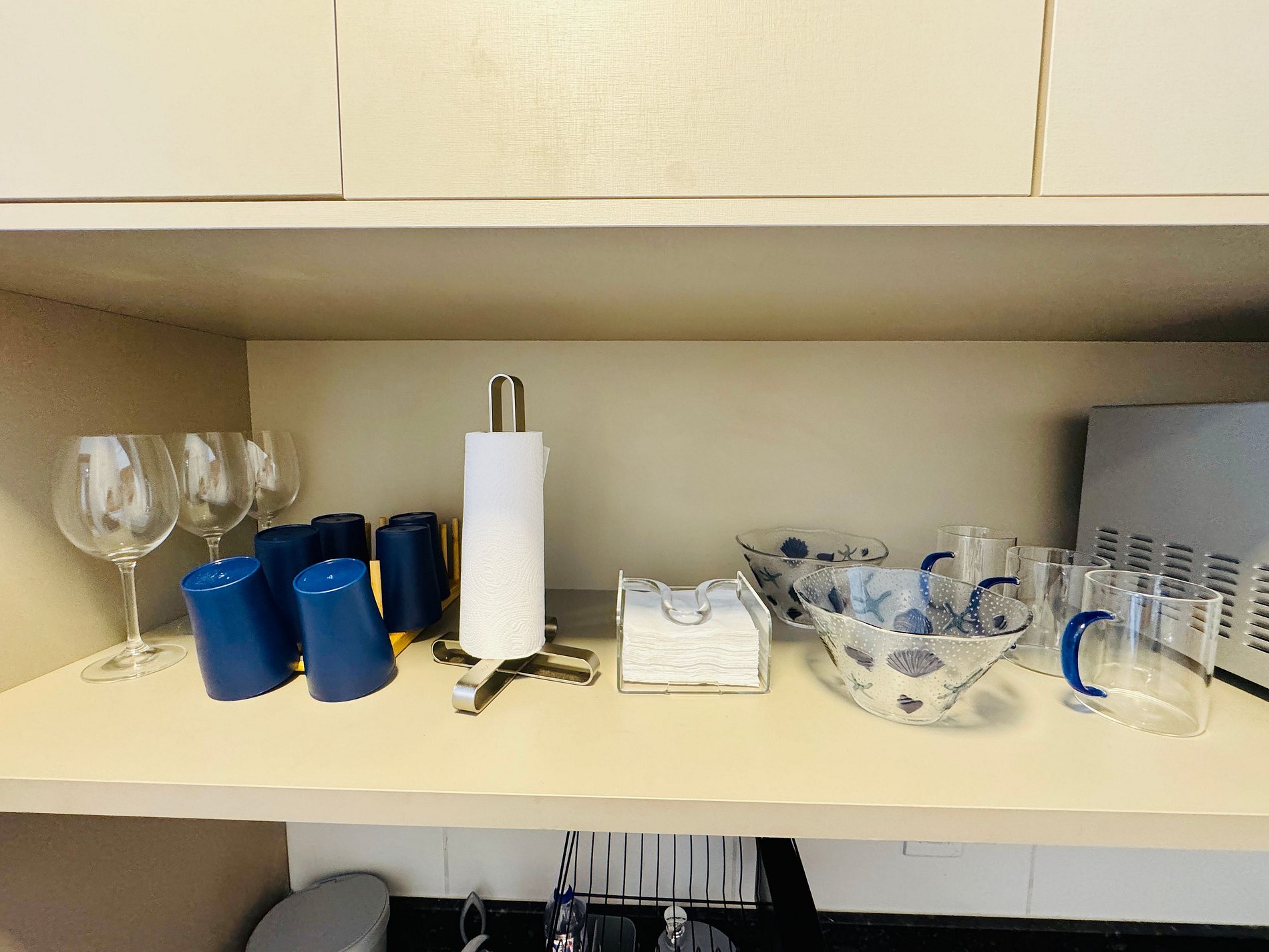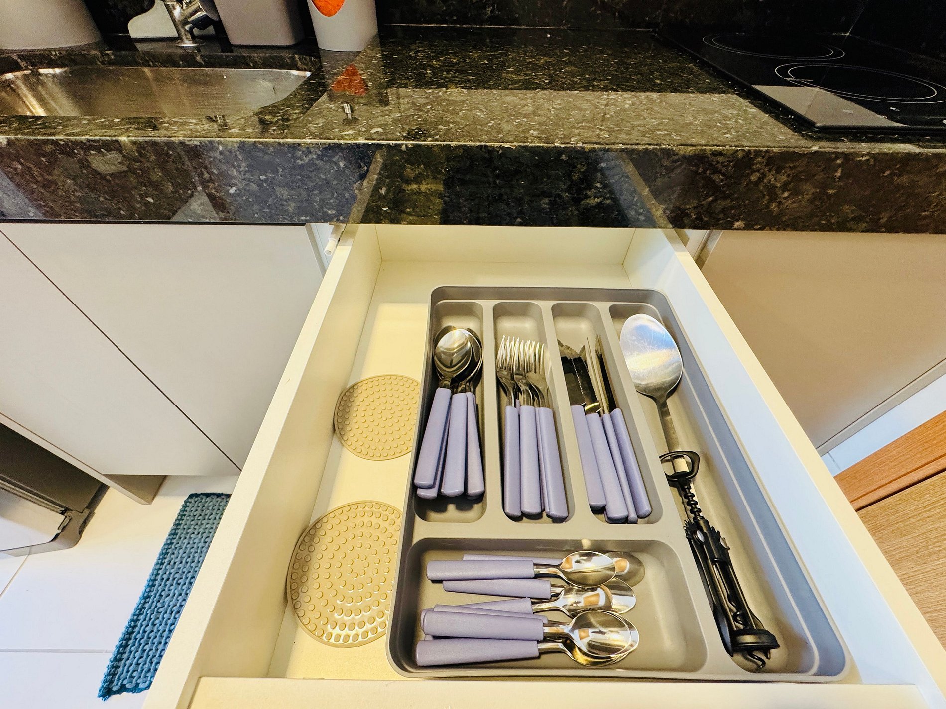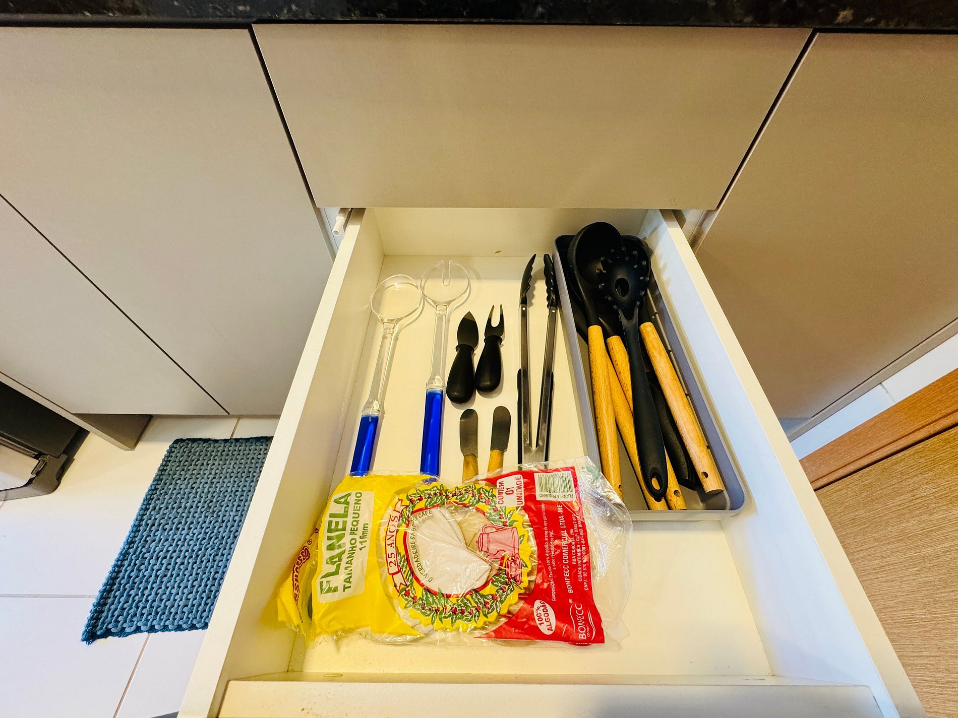 - Cozinha equipada com geladeira, micro-ondas, cooktop elétrico, cafeteira, airfryer, sanduicheira, liquidificador e utensílios diversos