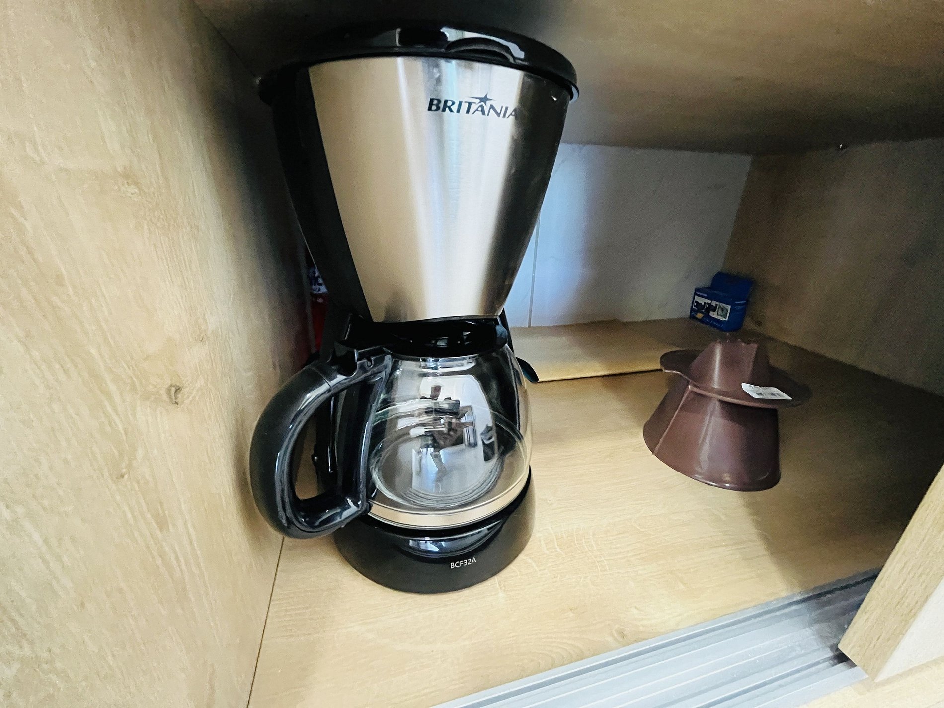 - Cozinha equipada com geladeira, micro-ondas, cooktop elétrico, cafeteira, sanduicheira, liquidificador e utensílios diversos