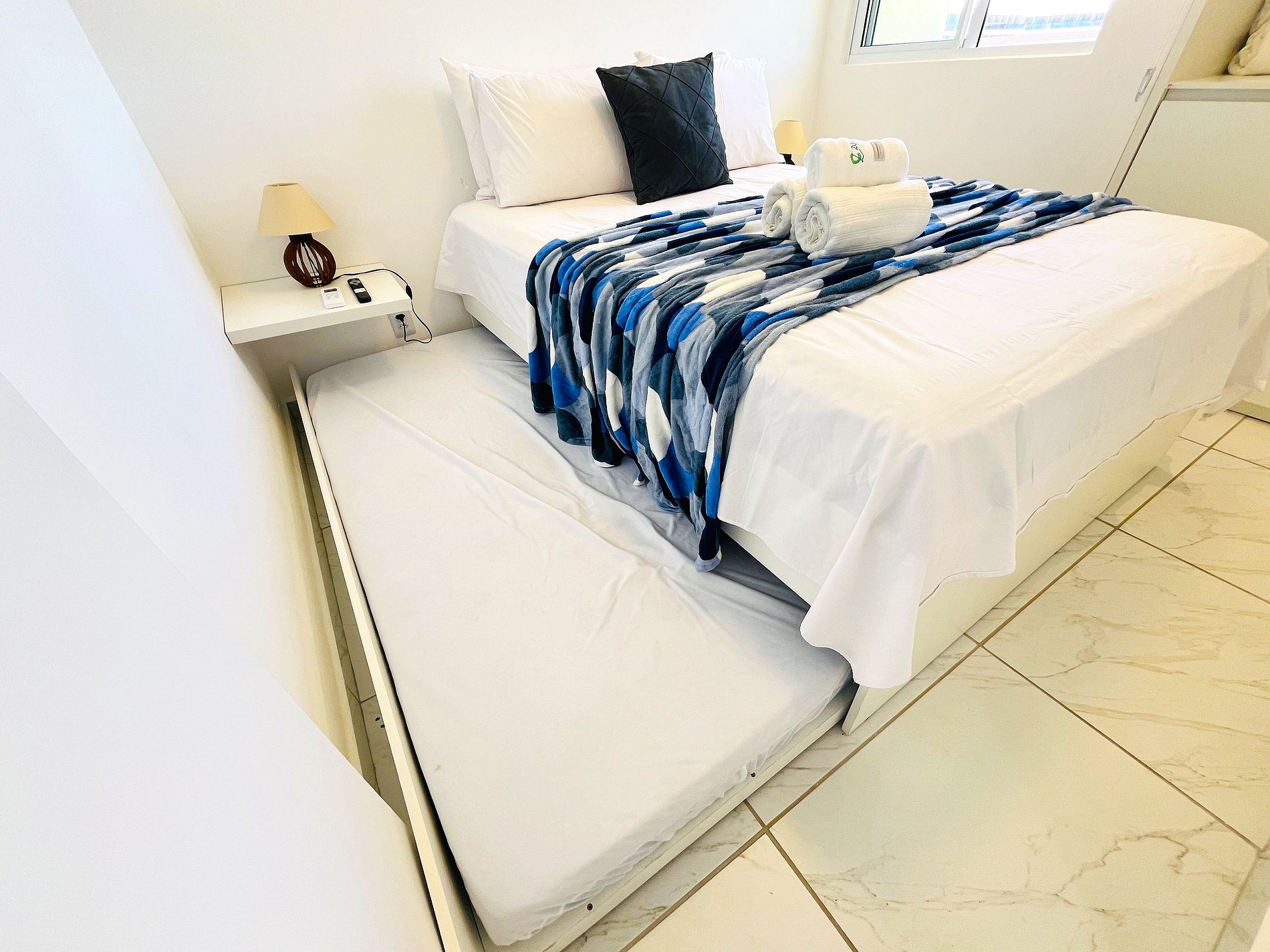 - 1 quarto com cama de casal com bicama de solteiro, com ar-condicionado