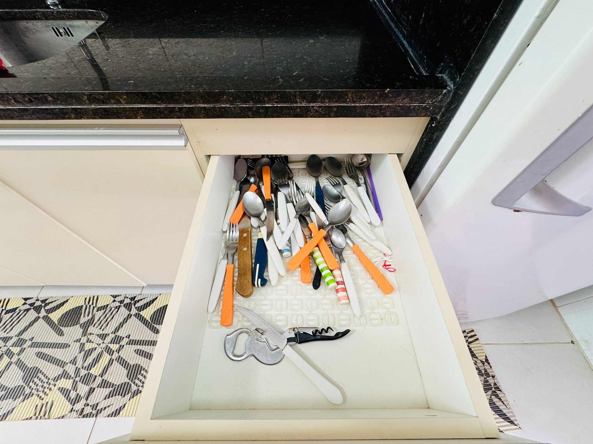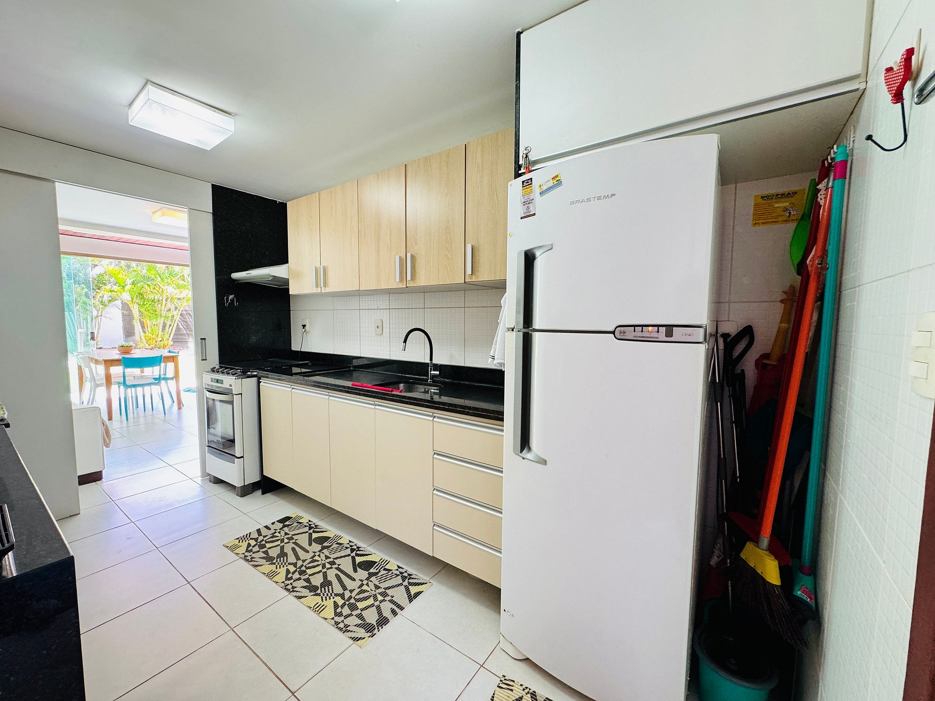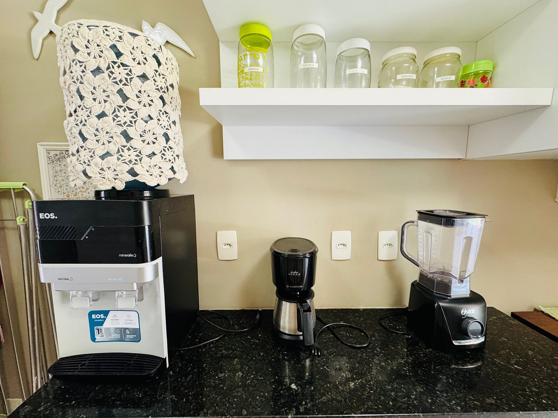 - Cozinha equipada com geladeira, micro-ondas, fogão com forno, cafeteira, liquidificador, filtro de água (reposição do garrafão feita pelo hóspede) e utensílios diversos;