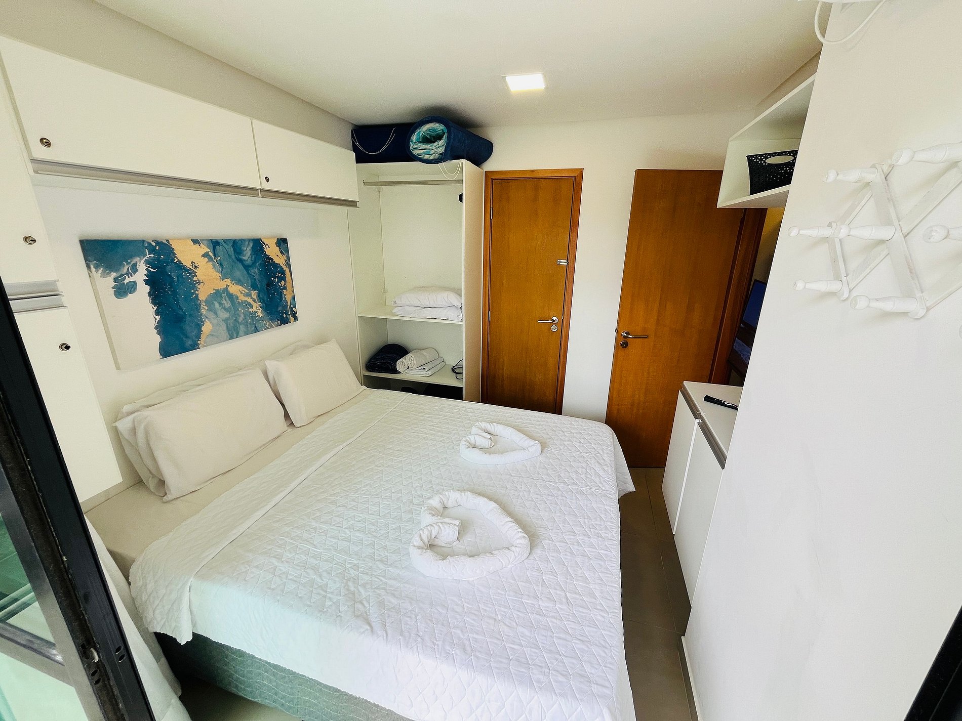 Flat confortável no Maraca Beach Residence 1 (4 hóspedes), com varanda, quarto duplo com cama de casal, sala de estar com sofá cama de casal, ar-condicionado acesso direto à beira-mar. O condomínio oferece piscina panorâmica na cobertura, espaço gourmet completo e recepção 24 horas. Ideal para casais ou famílias que buscam sossego, conforto e localização privilegiada, a poucos minutos de Porto de Galinhas.
