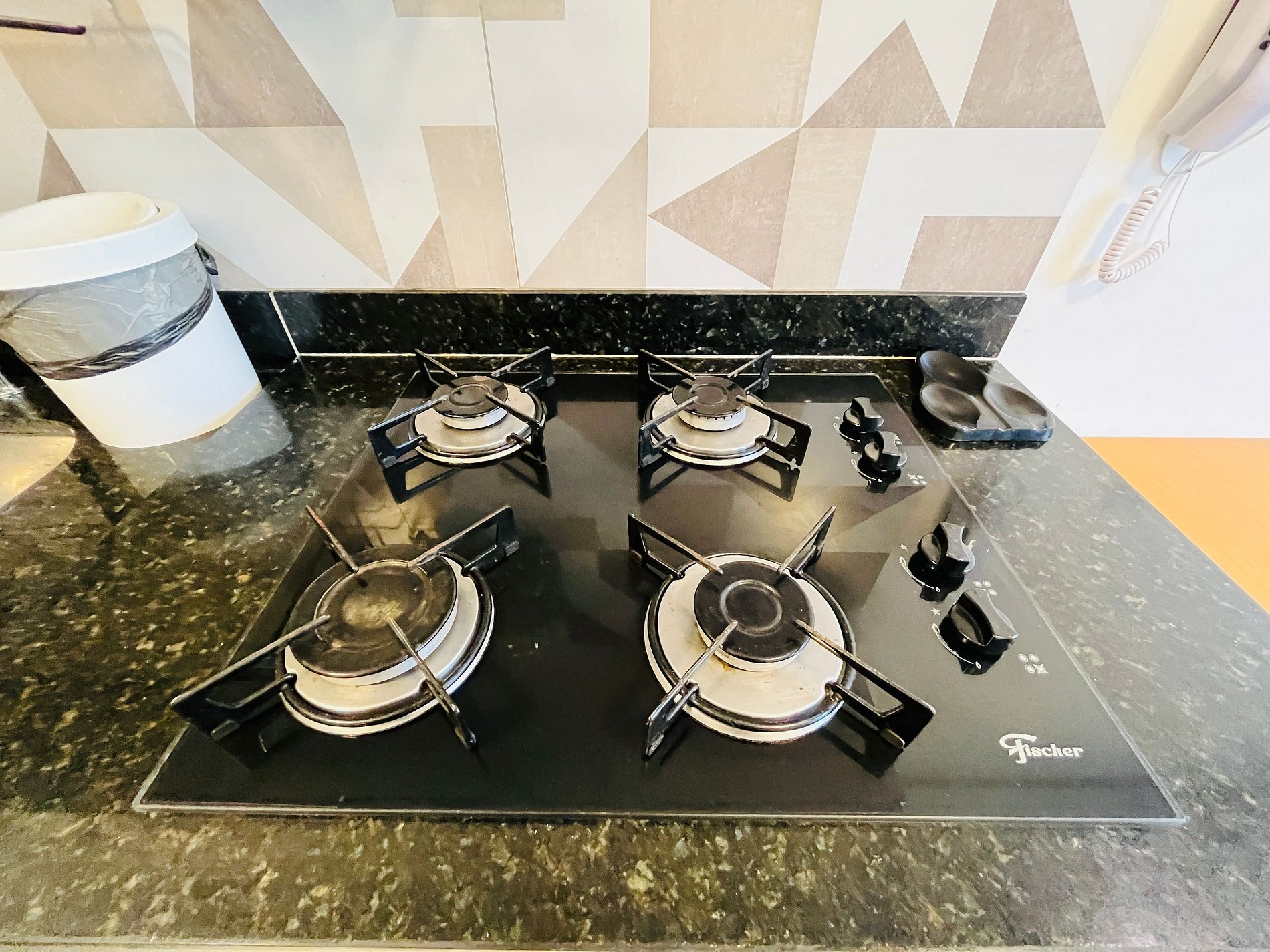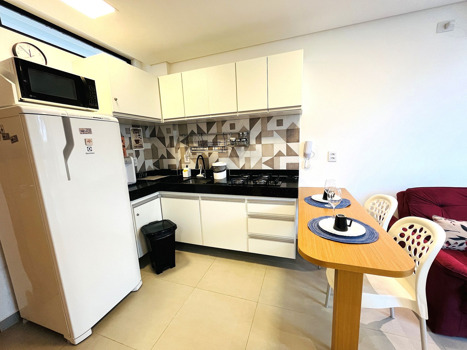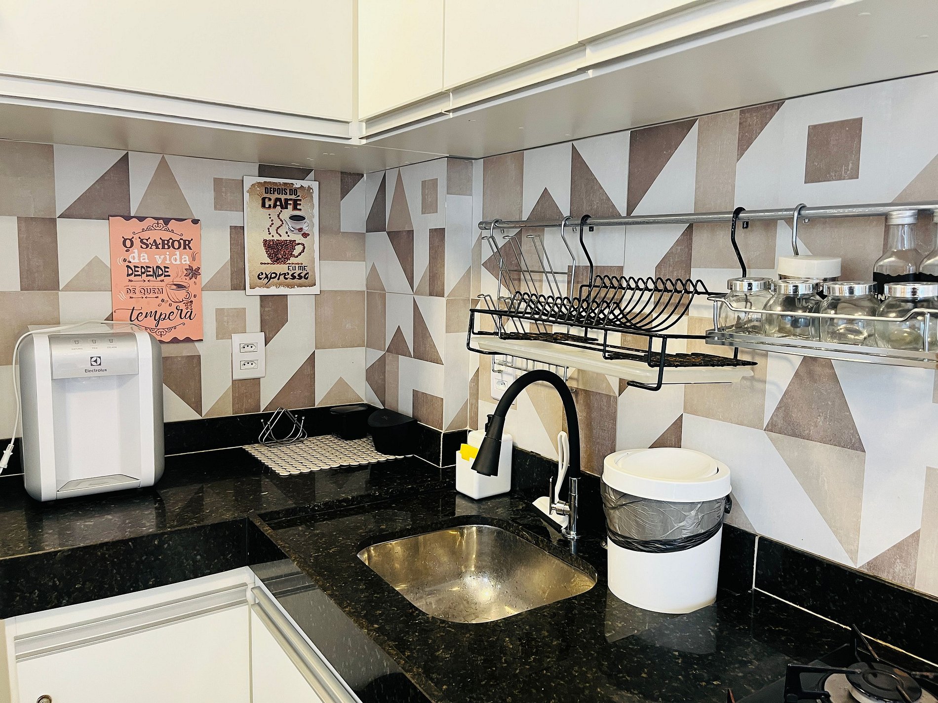 - Cozinha equipada com geladeira, micro-ondas, fogão, cafeteira, airfryer, liquidificador, sanduicheira, purificador de água e utensílios diversos