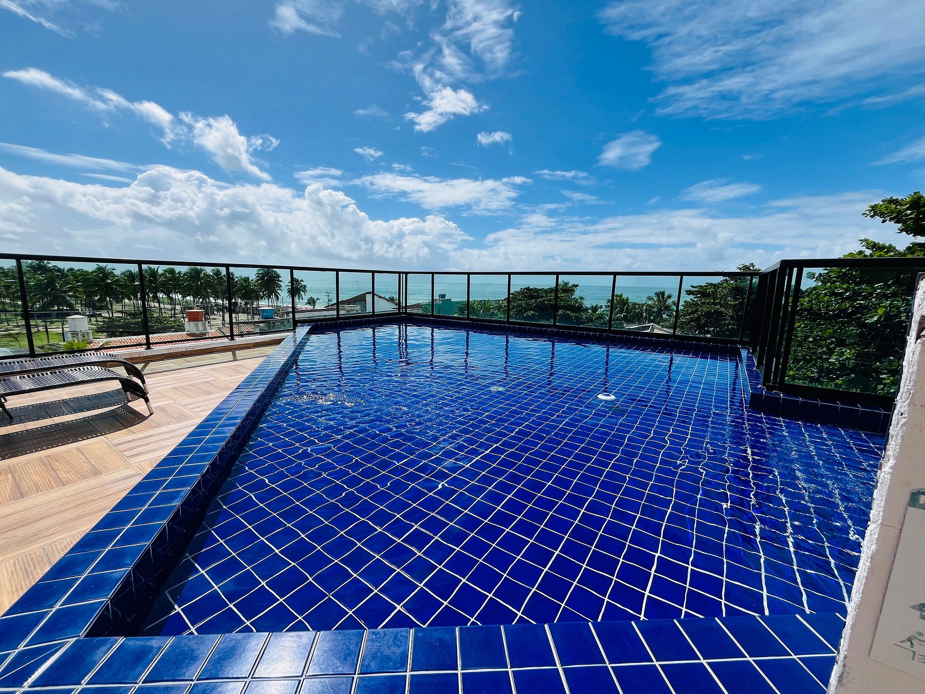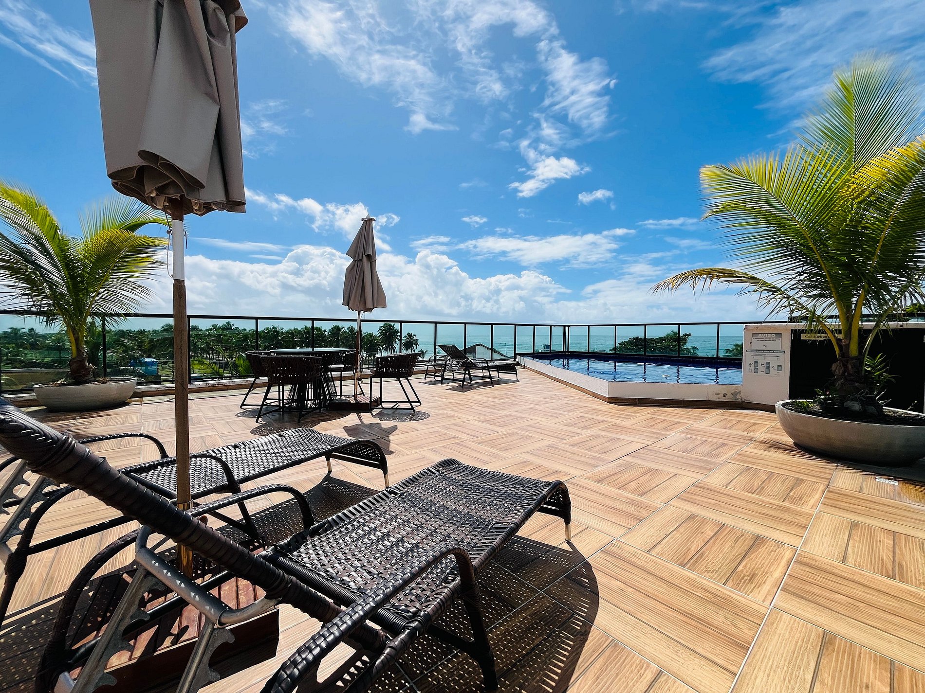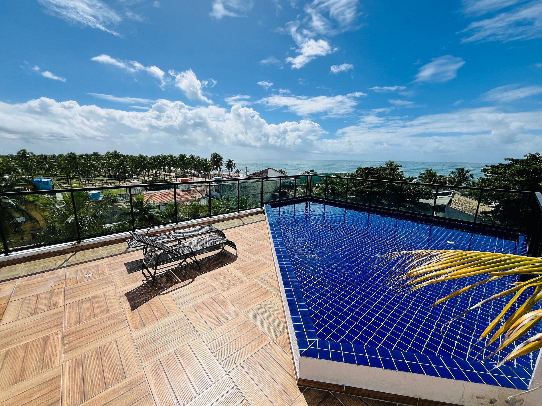 O condomínio Maraca Beach Residence conta com piscina panorâmica na cobertura, espaço gourmet equipado e acesso direto à praia de Maracaípe. A recepção decorada e climatizada completa a experiência com charme e segurança.