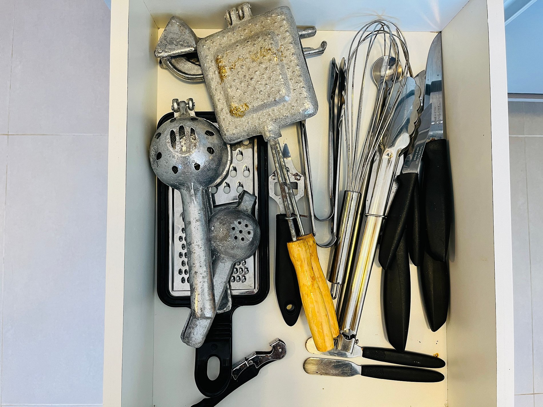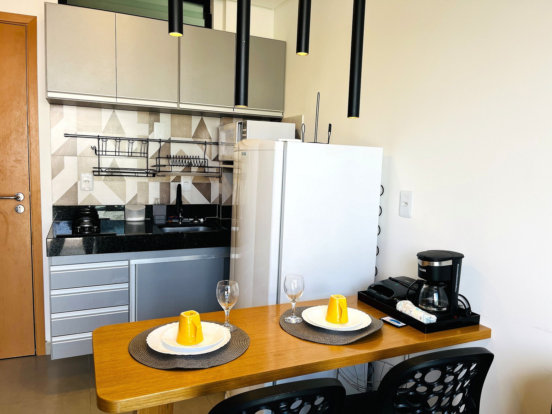 - Cozinha equipada com geladeira, micro-ondas, fogão, cafeteira, airfryer, liquidificador, sanduicheira, purificador de água e utensílios diversos