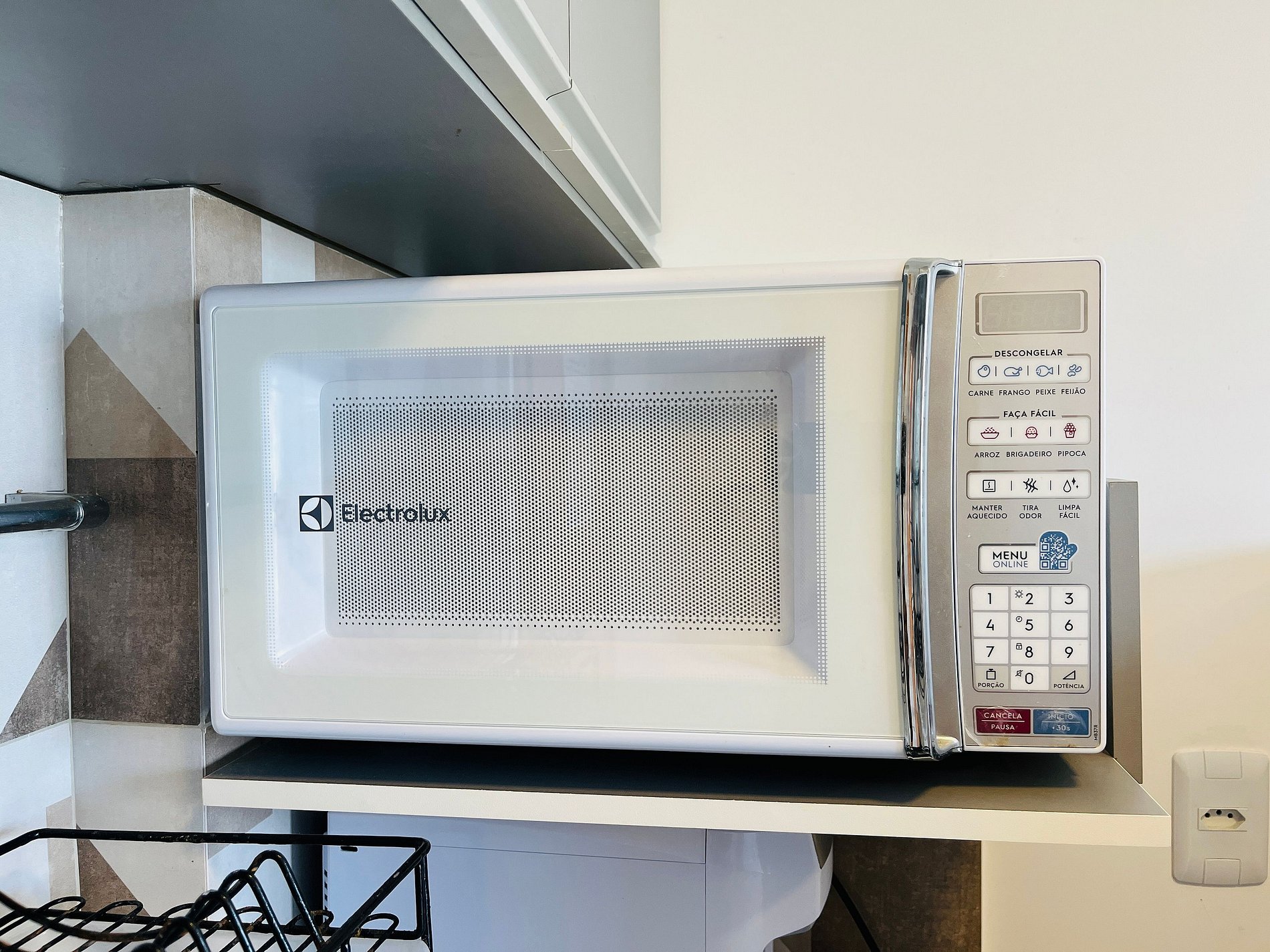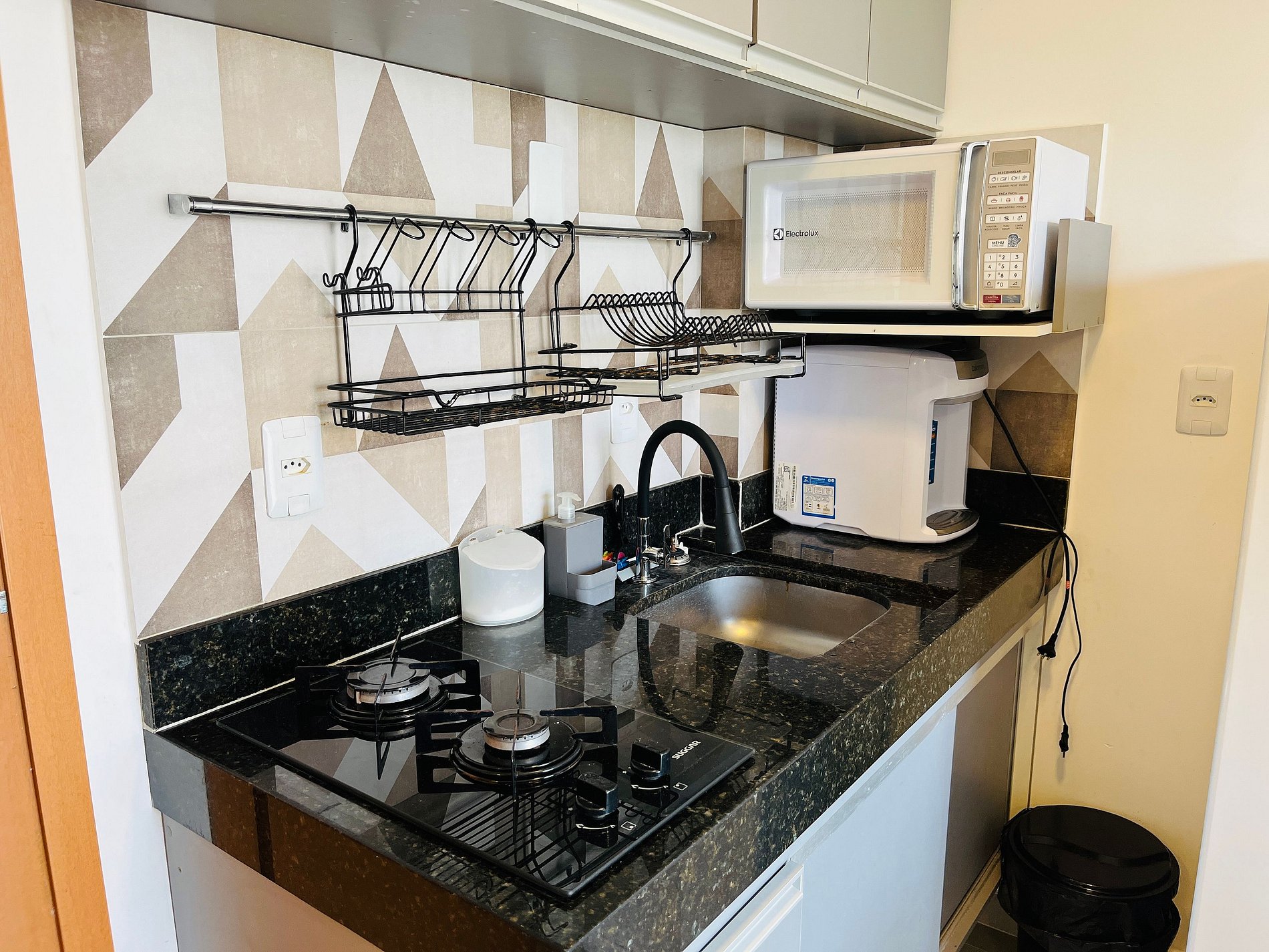 - Cozinha equipada com geladeira, micro-ondas, fogão, cafeteira, airfryer, liquidificador, sanduicheira, purificador de água e utensílios diversos