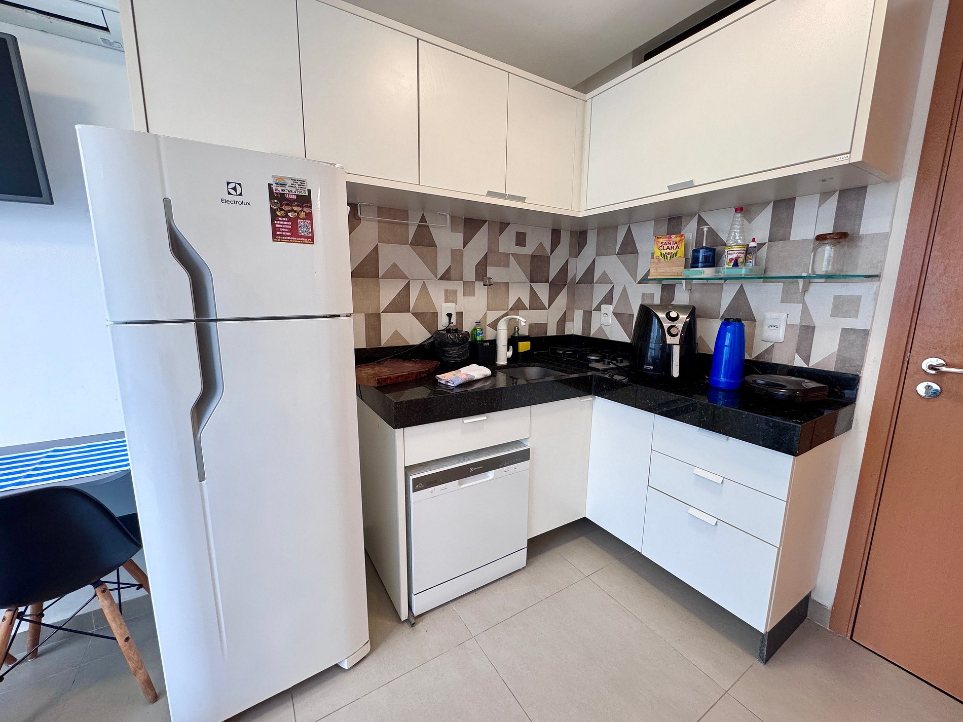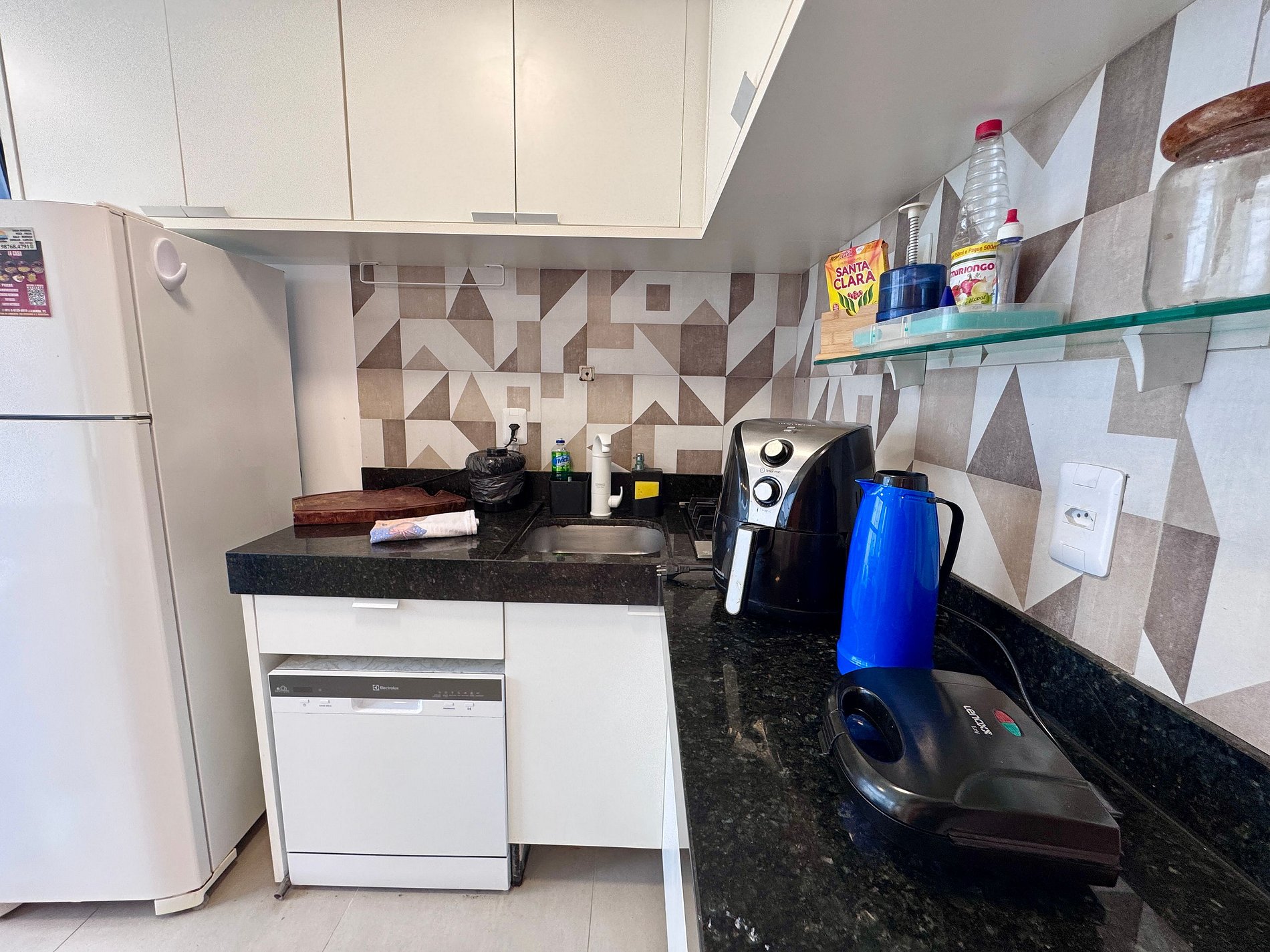 - Cozinha equipada com geladeira, fogão, microondas, airfryer, cafeteira, liquidificador, sanduicheira e utensílios diversos
