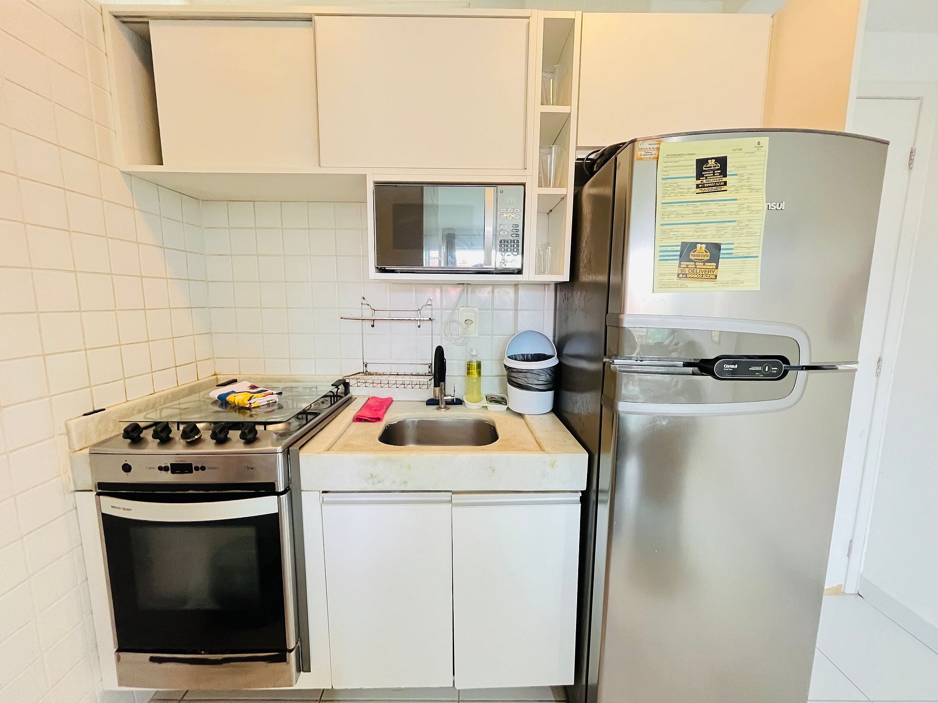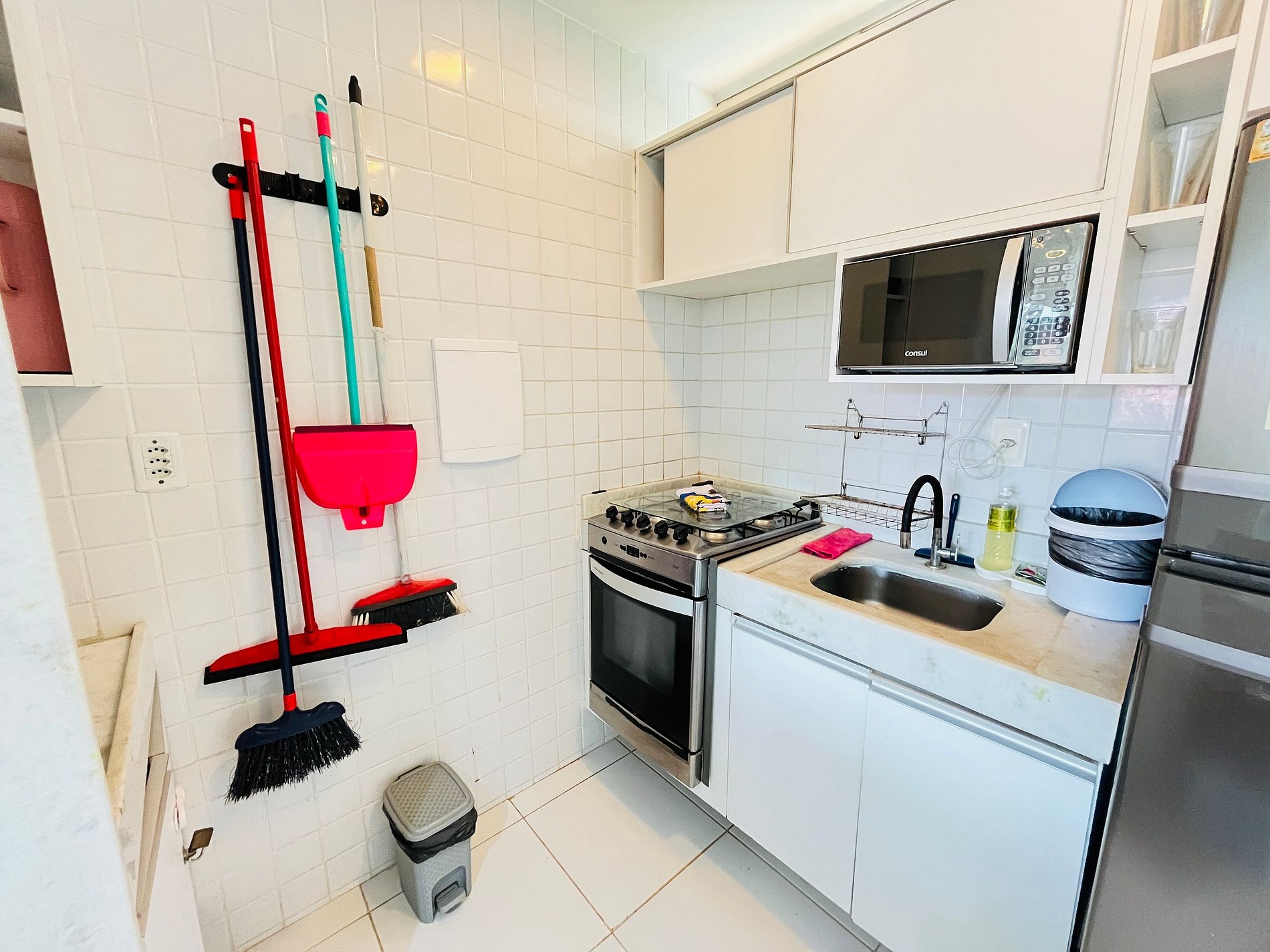 - Cozinha equipada com geladeira, micro-ondas, fogão, forno, cafeteira, liquidificador e utensílios diversos