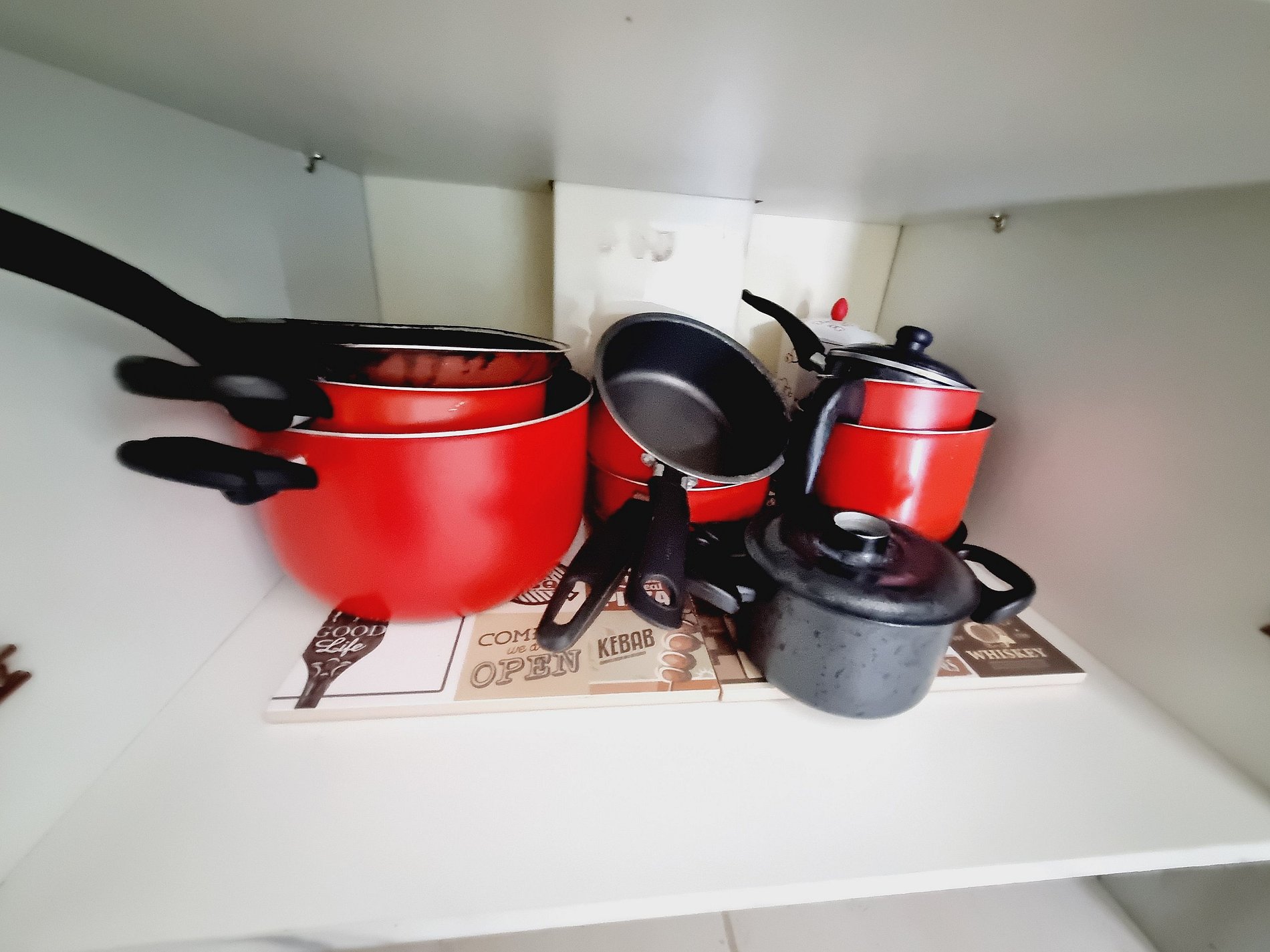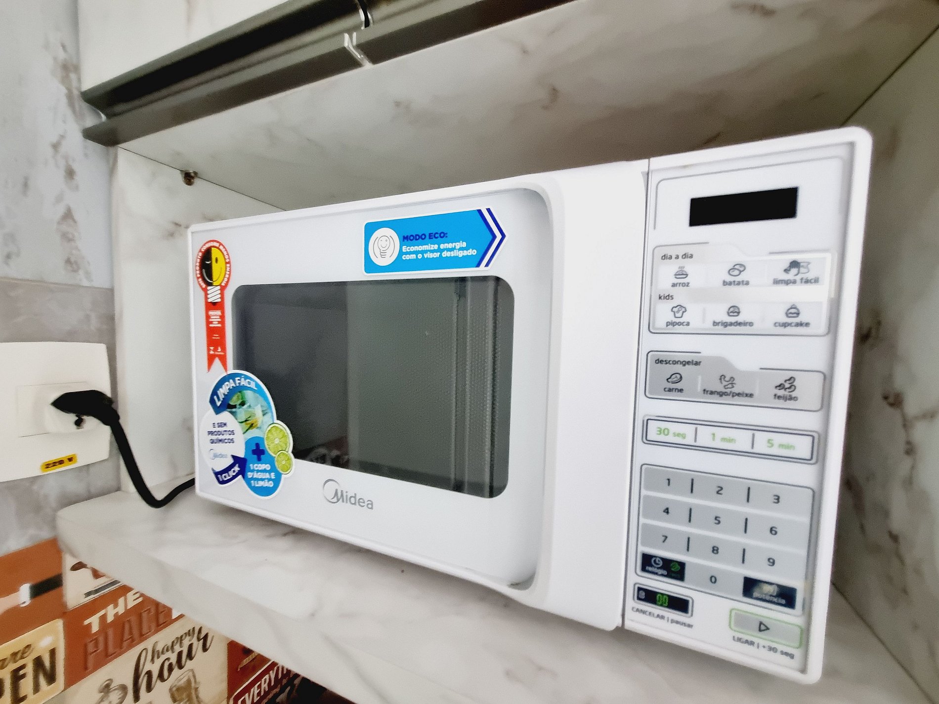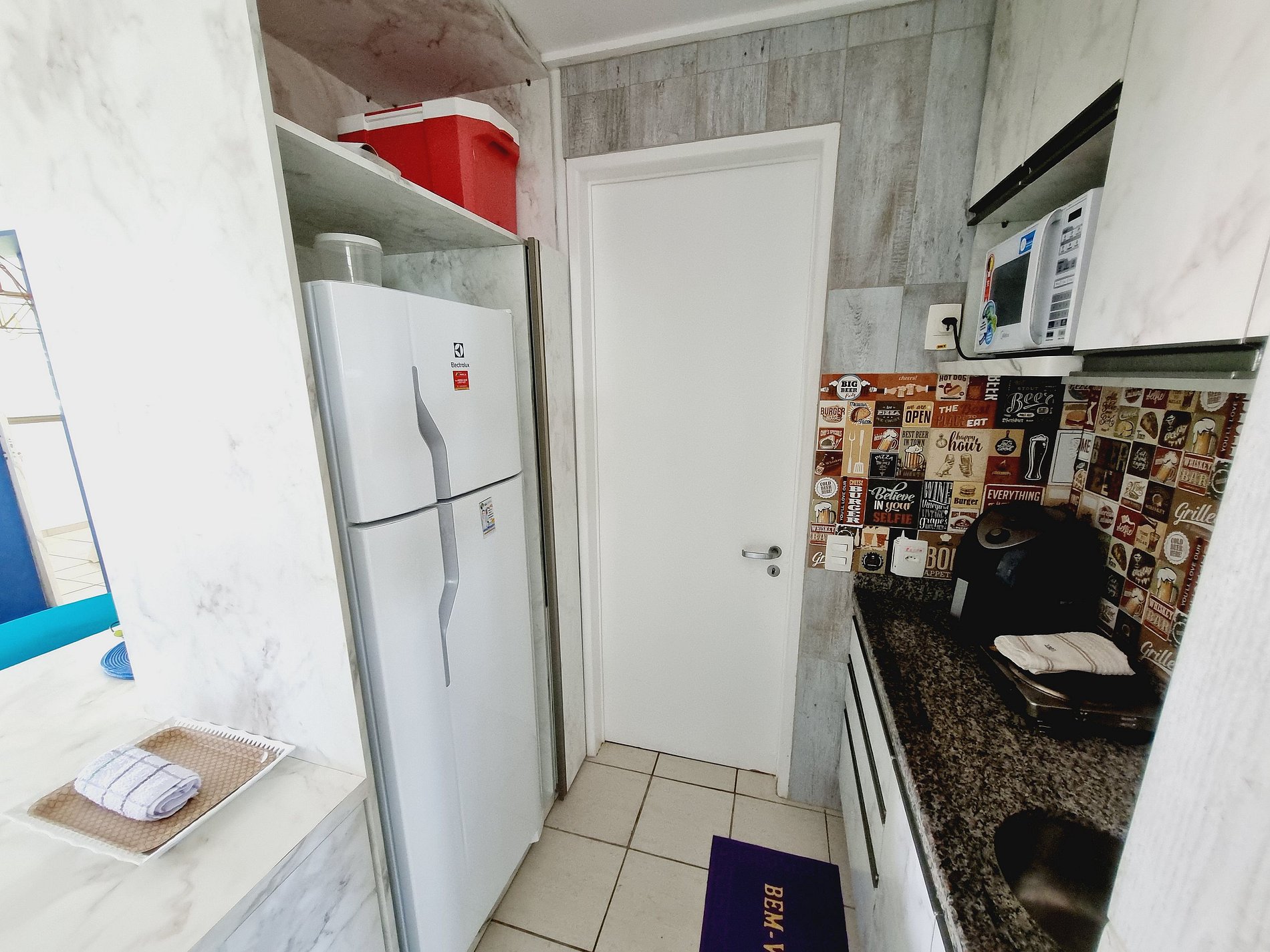 - Cozinha equipada com geladeira, micro-ondas, cooktop elétrico, airfryer, cafeteira, sanduicheira e utensílios diversos