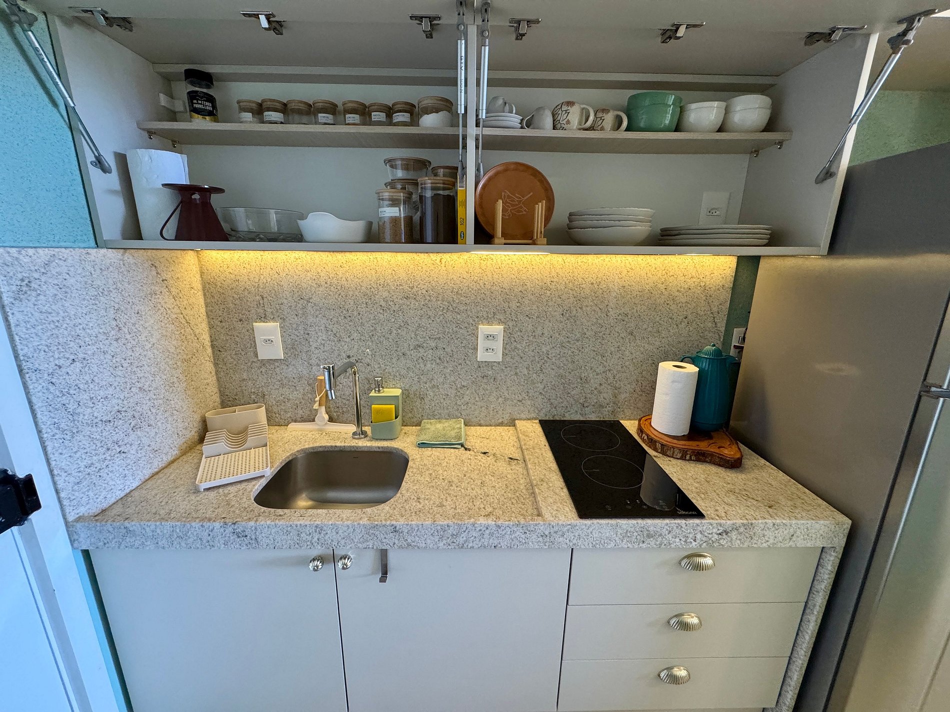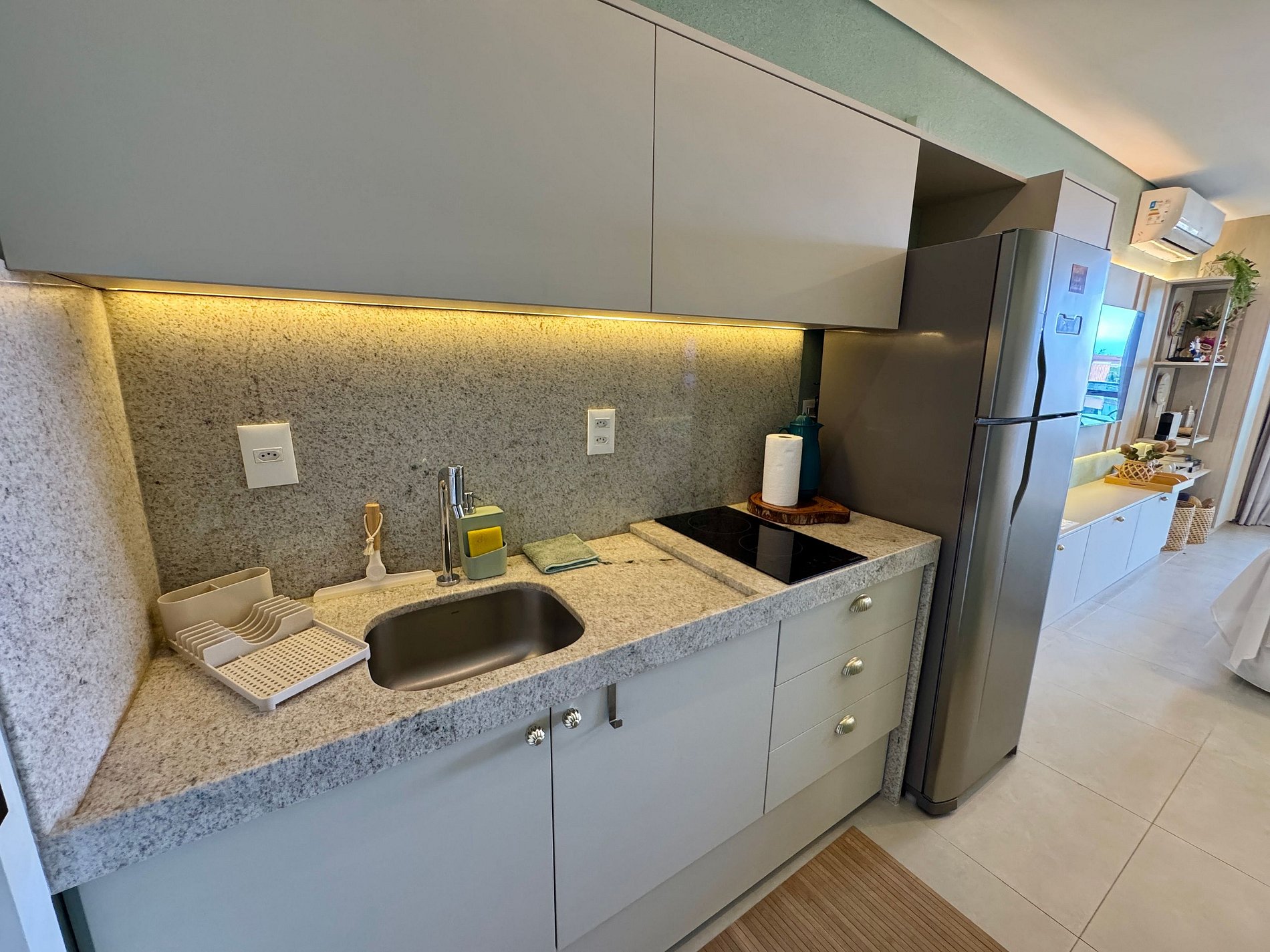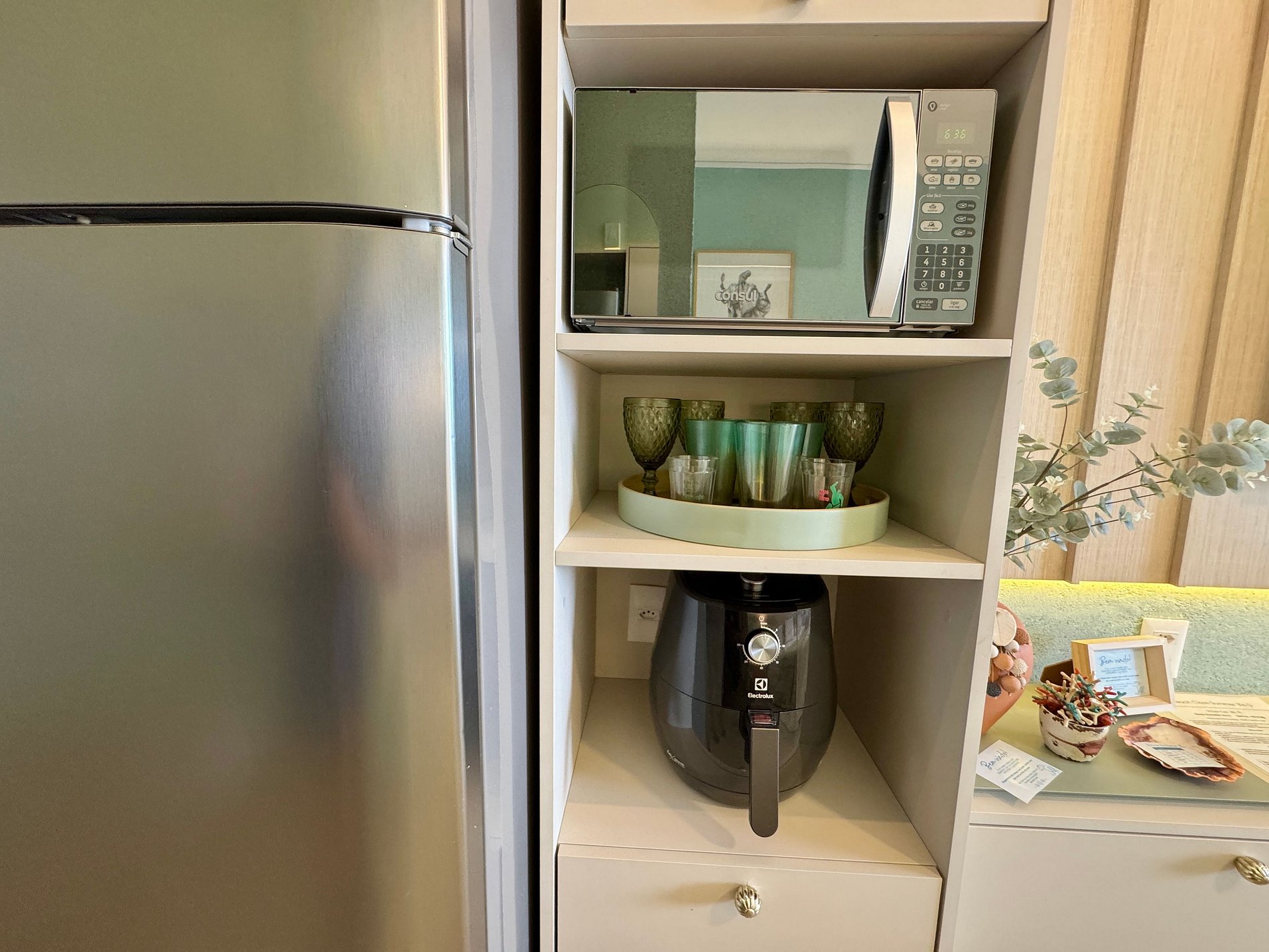 - Cozinha equipada com geladeira, micro-ondas, cooktop elétrico, airfryer, liquidificador, cafeteira e utensílios diversos