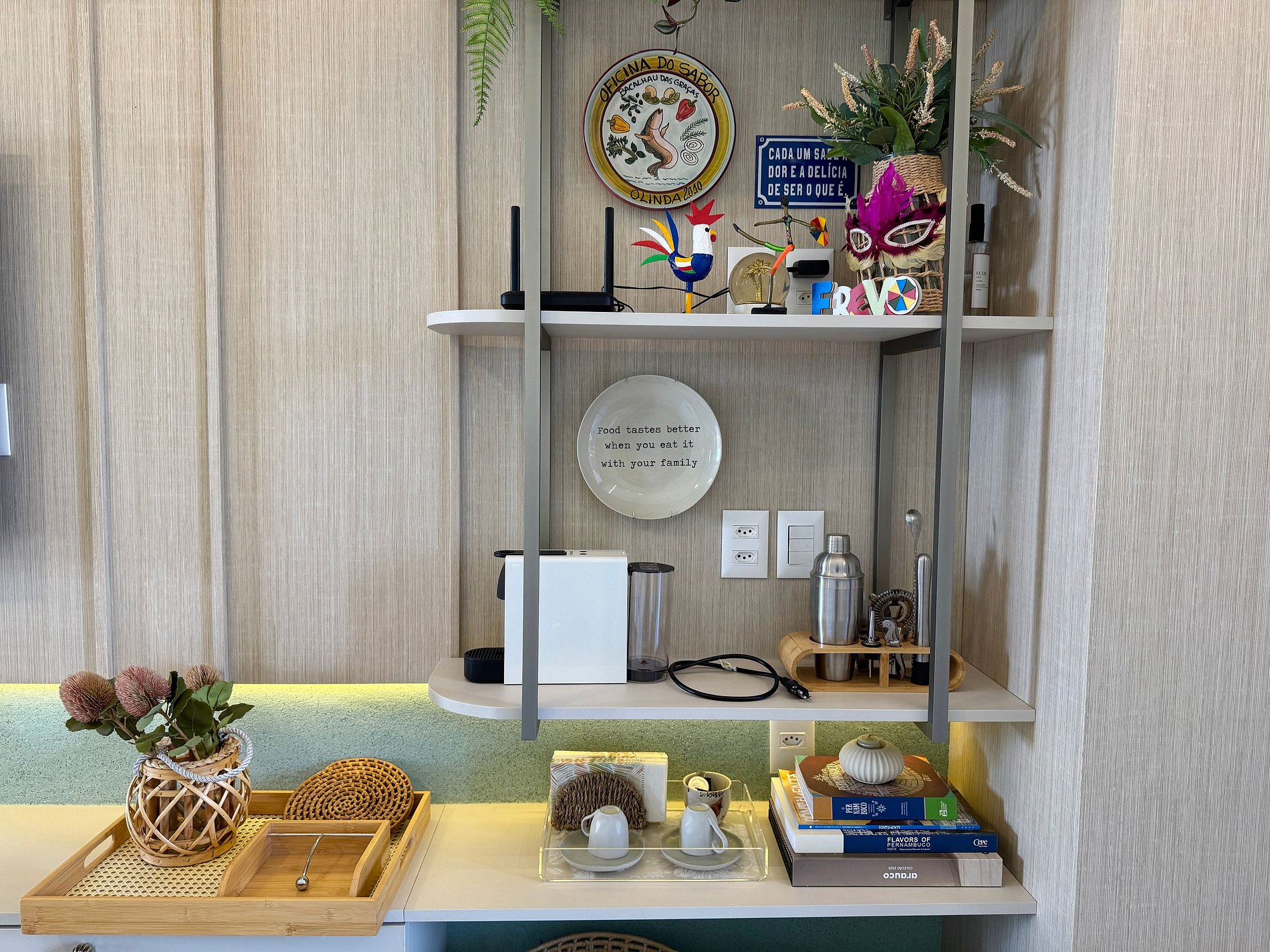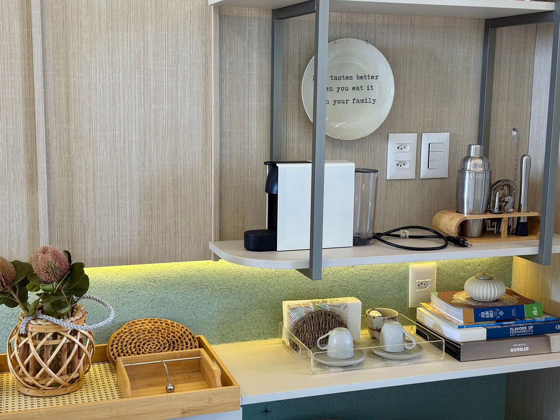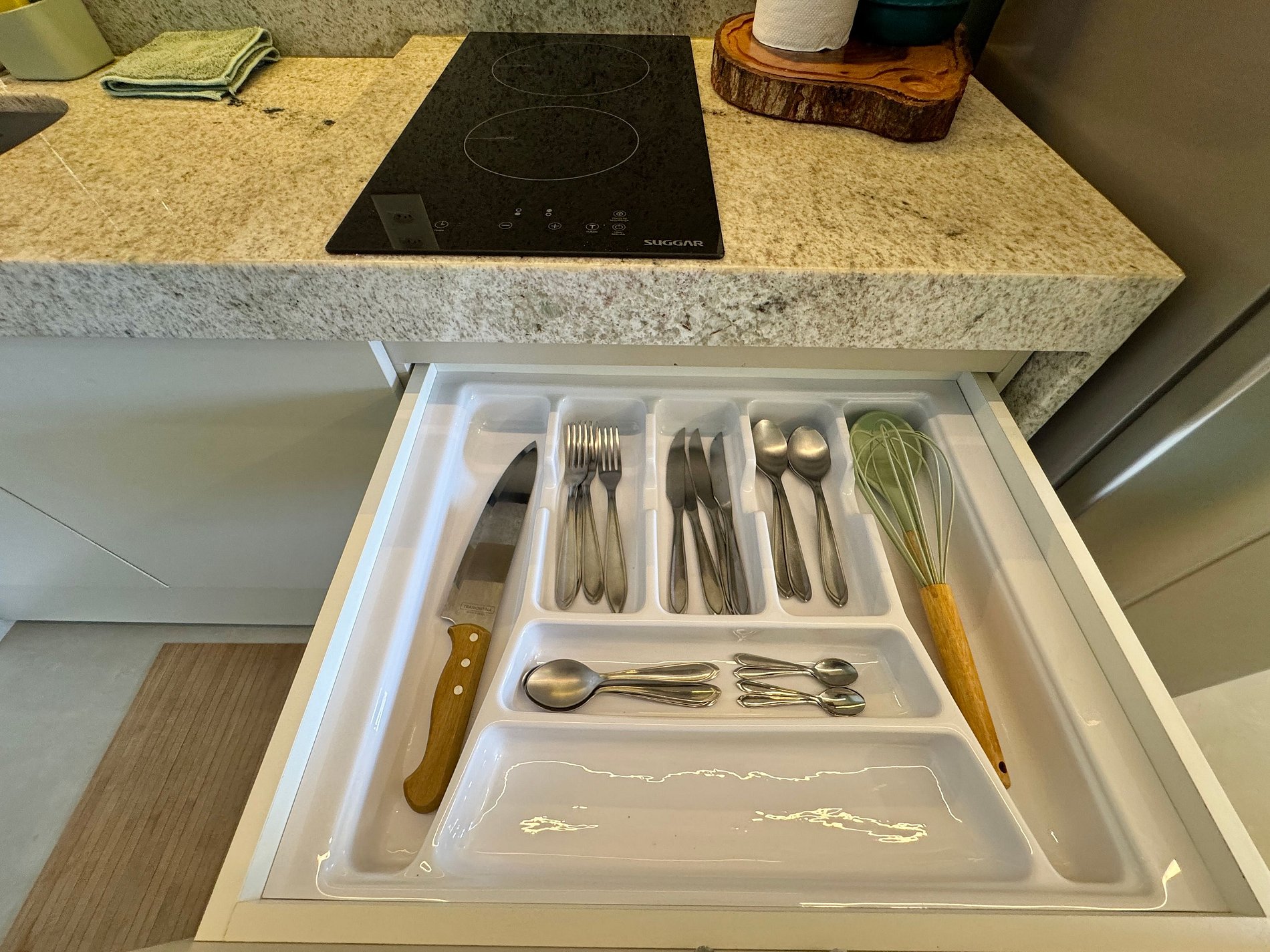 - Cozinha equipada com geladeira, micro-ondas, cooktop elétrico, airfryer, liquidificador, cafeteira e utensílios diversos