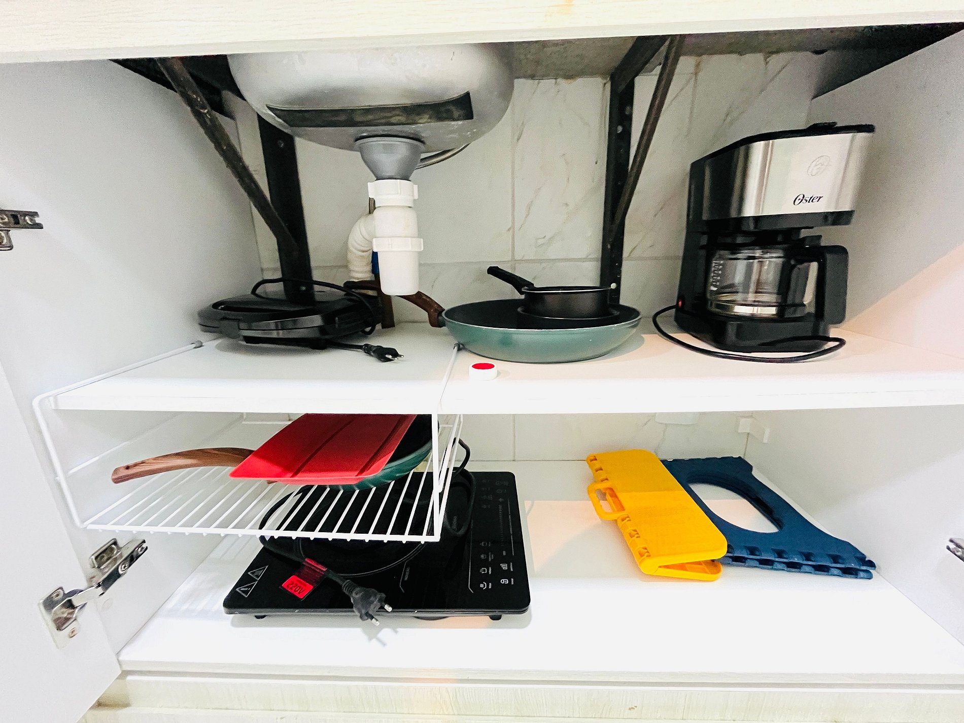 - Cozinha equipada com geladeira, micro-ondas, cooktop elétrico, airfry, cafeteira, sanduicheira, passadeira a vapor e utensílios diversos