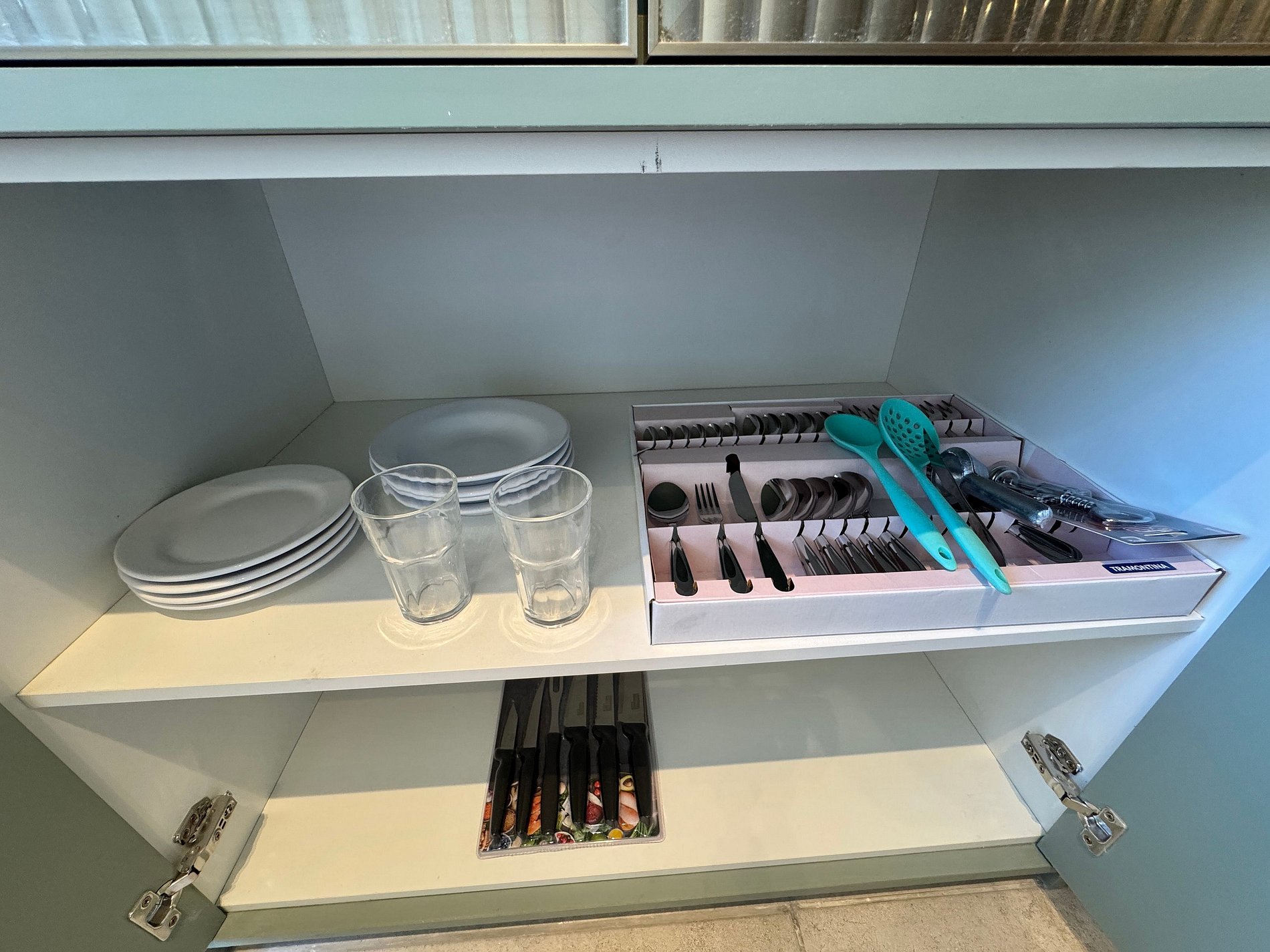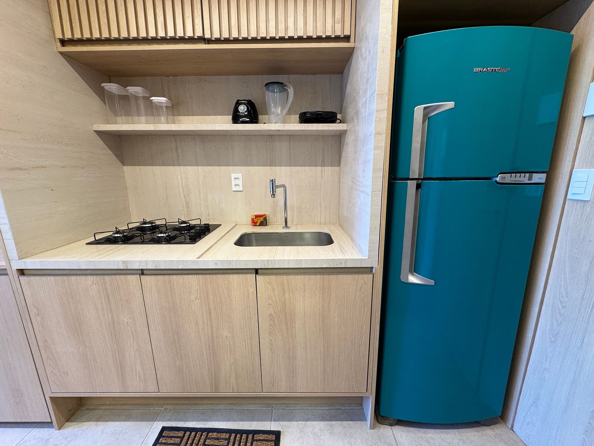 - Cozinha equipada com geladeira, micro-ondas, fogão elétrico, airfryer, sanduicheira, liquidificador e utensílios diversos