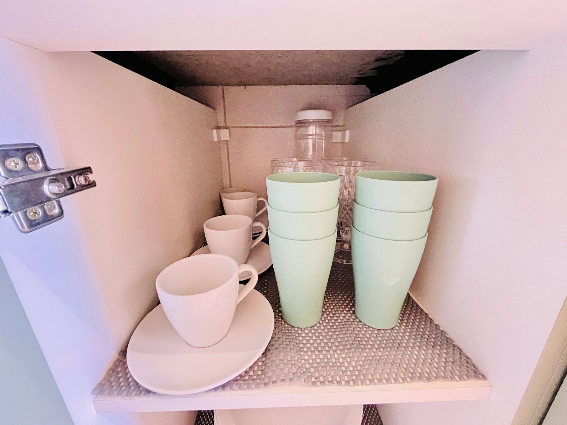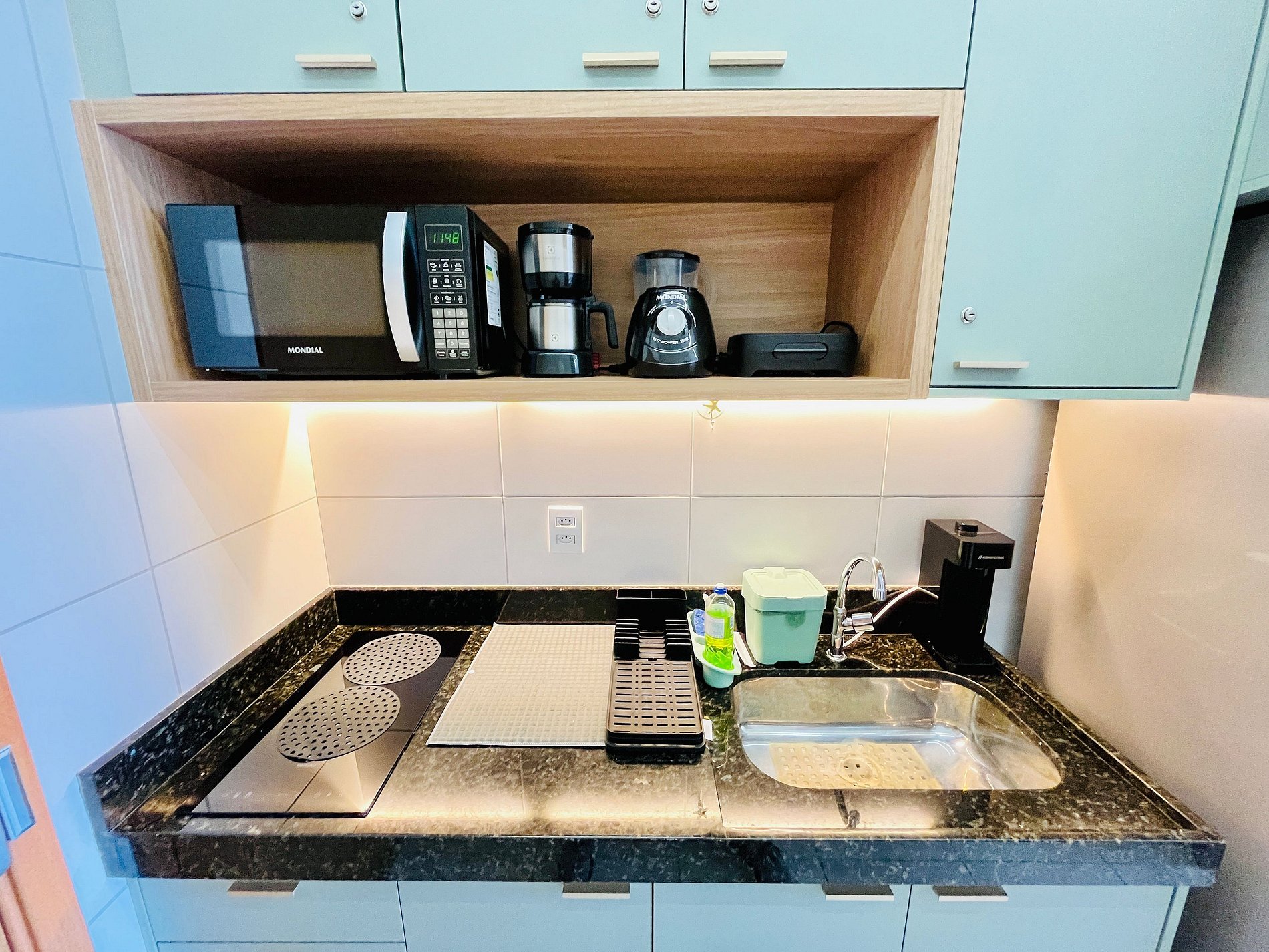 - Cozinha equipada com geladeira, micro-ondas, cooktop elétrico, cafeteira, sanduicheira, liquidificador e utensílios diversos