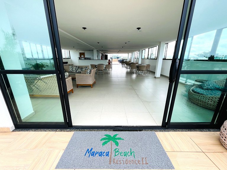 O condomínio Maraca Beach Residence 2 conta com piscina panorâmica na cobertura, loja de conveniência e acesso direto à praia de Maracaípe. A recepção decorada e climatizada completa a experiência com charme e segurança.