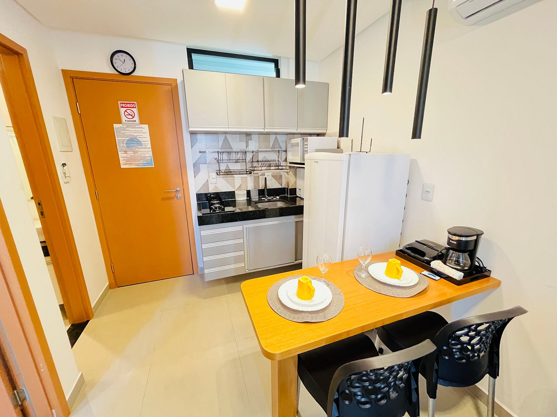 - Cozinha equipada com geladeira, micro-ondas, fogão, cafeteira, airfryer, liquidificador, sanduicheira, purificador de água e utensílios diversos